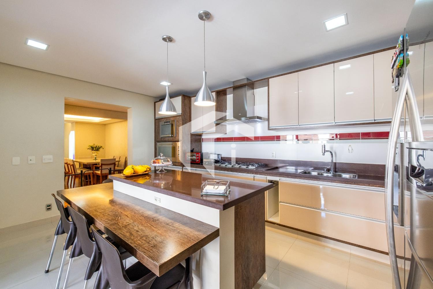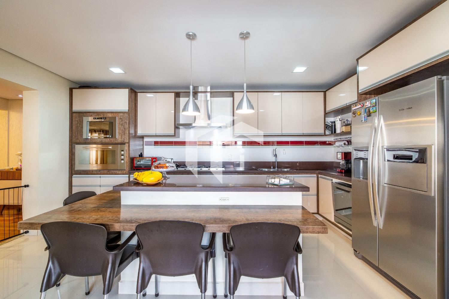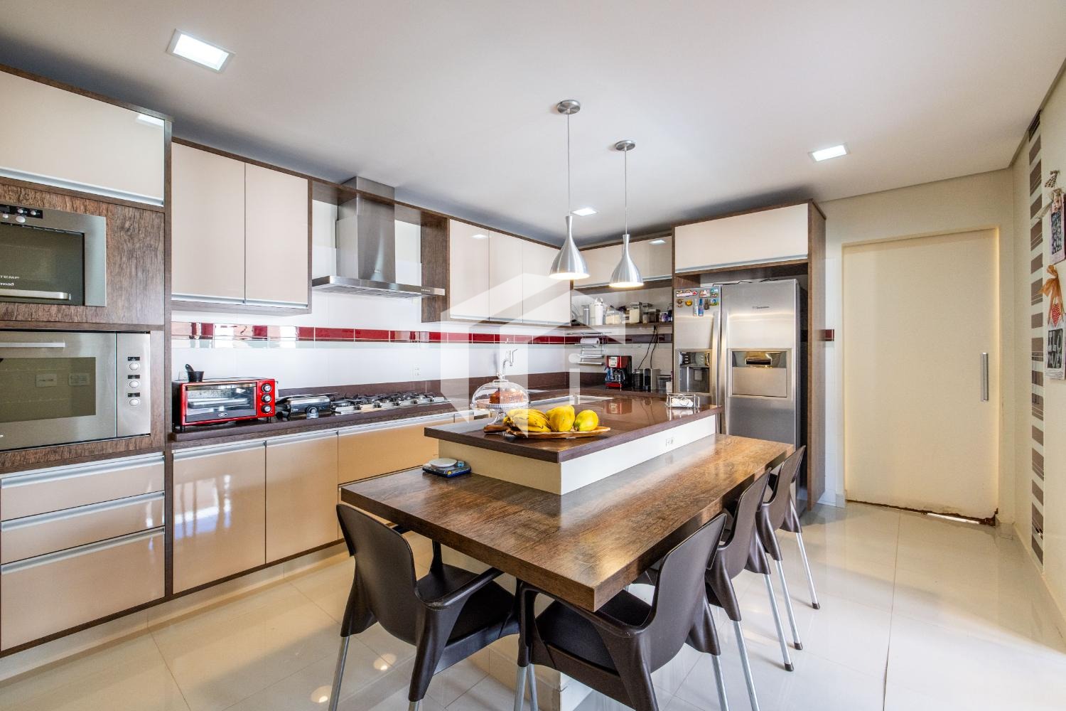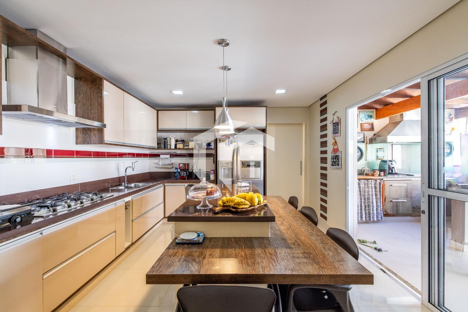 Cozinha ampla e completa em marcenaria com bancadas de copa de apoio.