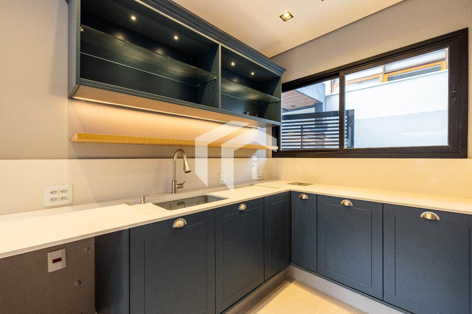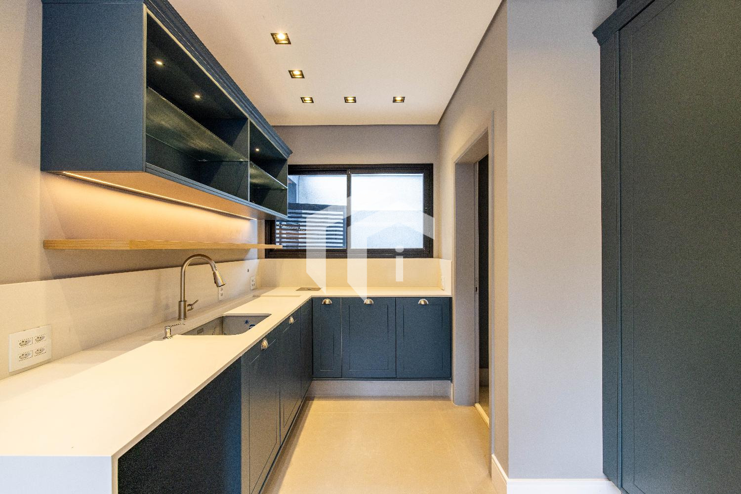 Cozinha americana repleta de armários e com despensa, mais, área de serviço com wc.