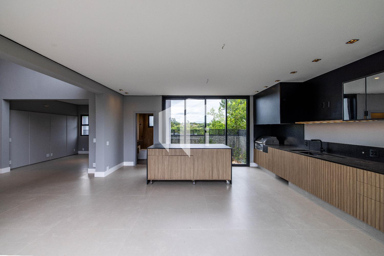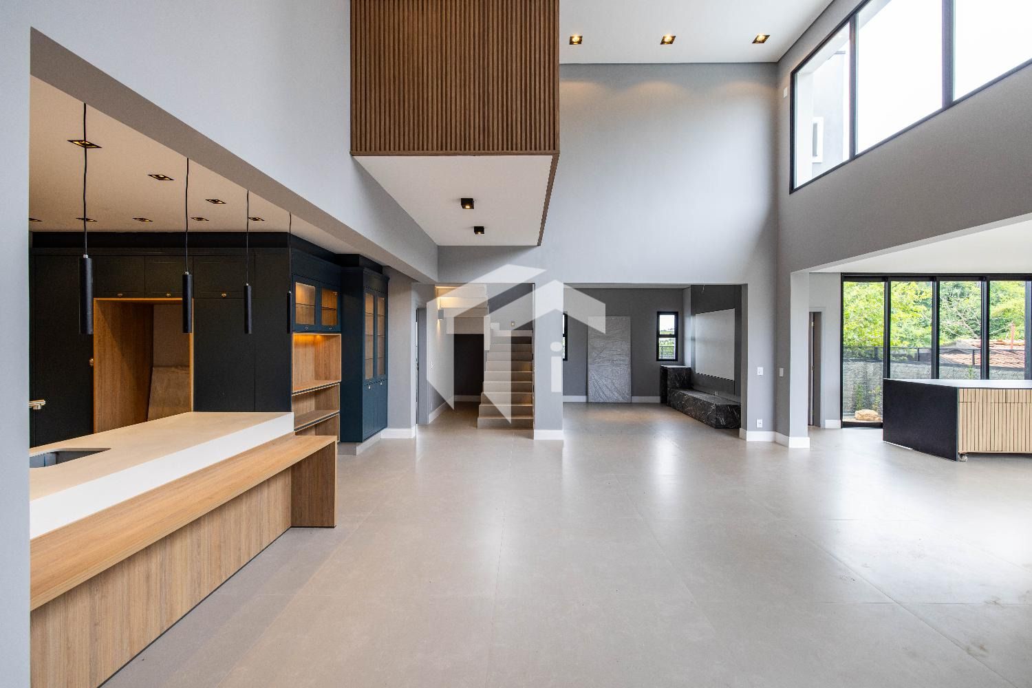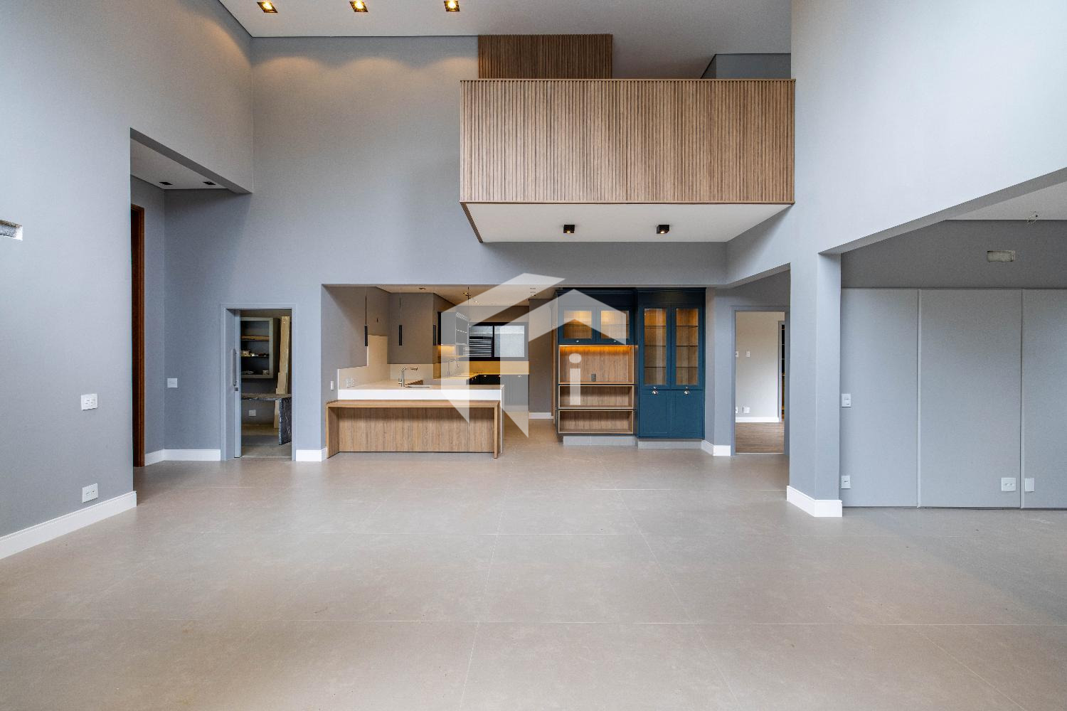 Living climatizado para 3 ambientes com pé direito duplo, mais, home office e home theater, e totalmente integrado ao convidativo espaço gourmet do imóvel.
