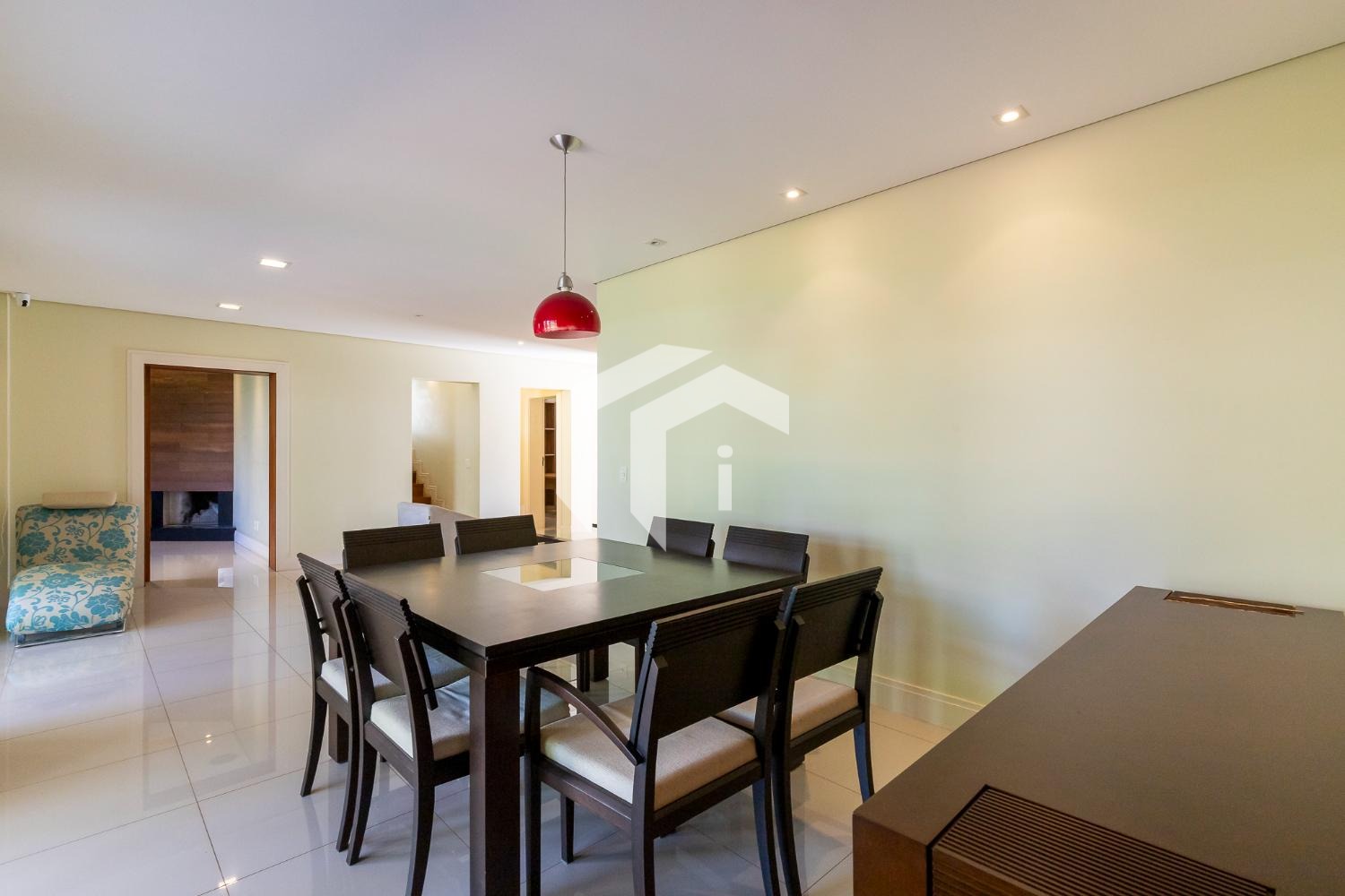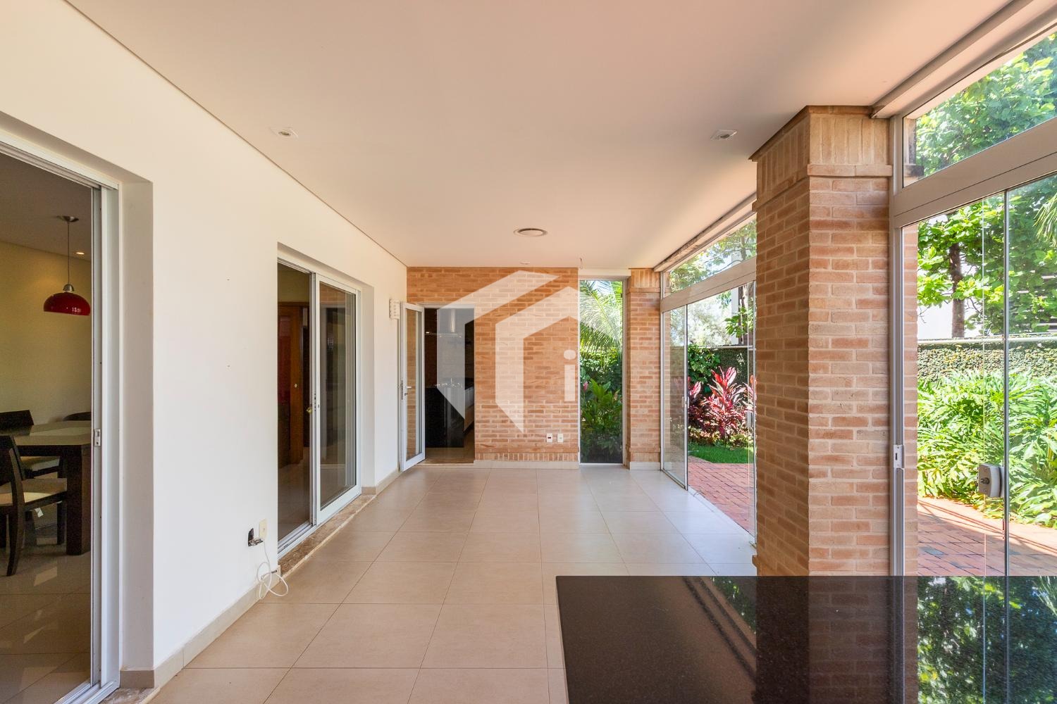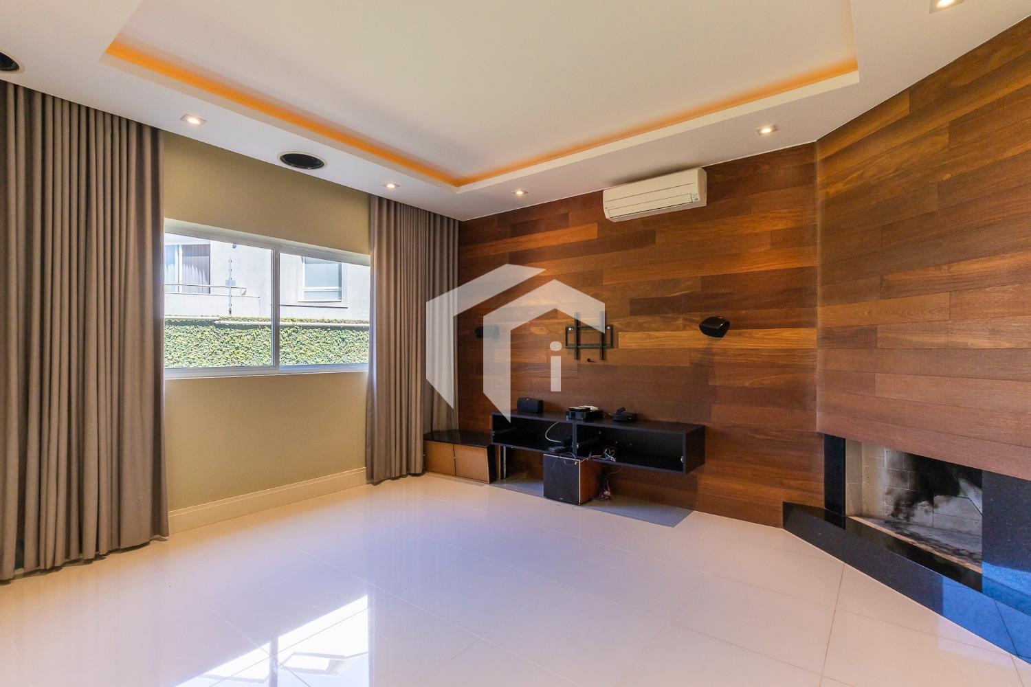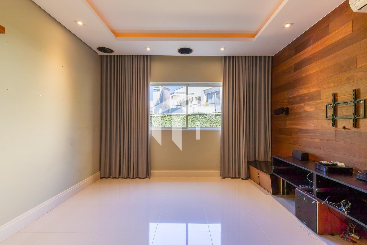 No piso térreo, o living em “L” impressiona pela amplitude e integração, com grandes portas-balcão que conectam os ambientes internos à área gourmet, criando uma atmosfera perfeita para receber. O imóvel conta ainda com um elegante home theater e um escritório, que pode ser facilmente adaptado para uma suíte térrea.