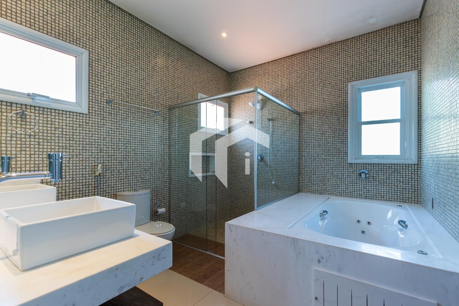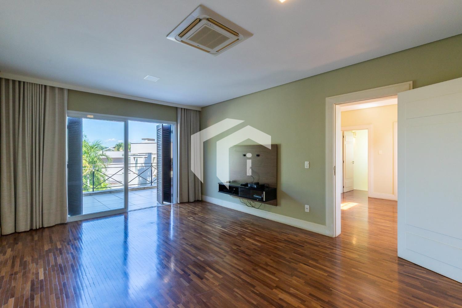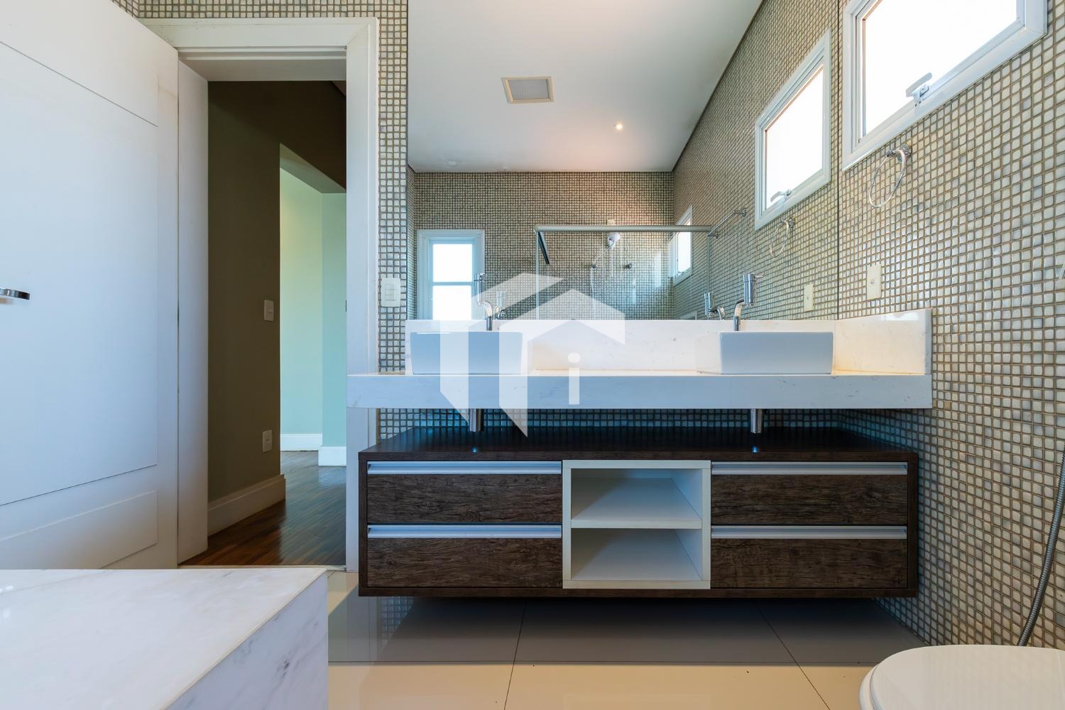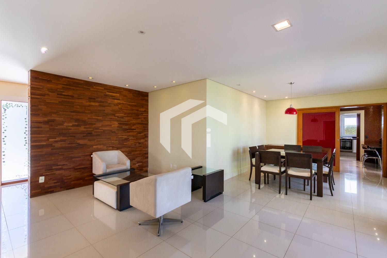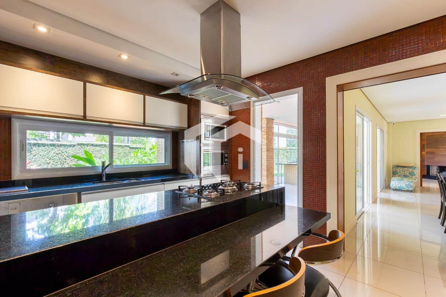 No piso térreo, o living em “L” impressiona pela amplitude e integração, com grandes portas-balcão que conectam os ambientes internos à área gourmet, criando uma atmosfera perfeita para receber. O imóvel conta ainda com um elegante home theater e um escritório, que pode ser facilmente adaptado para uma suíte térrea.