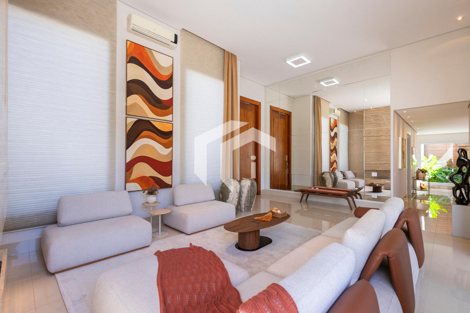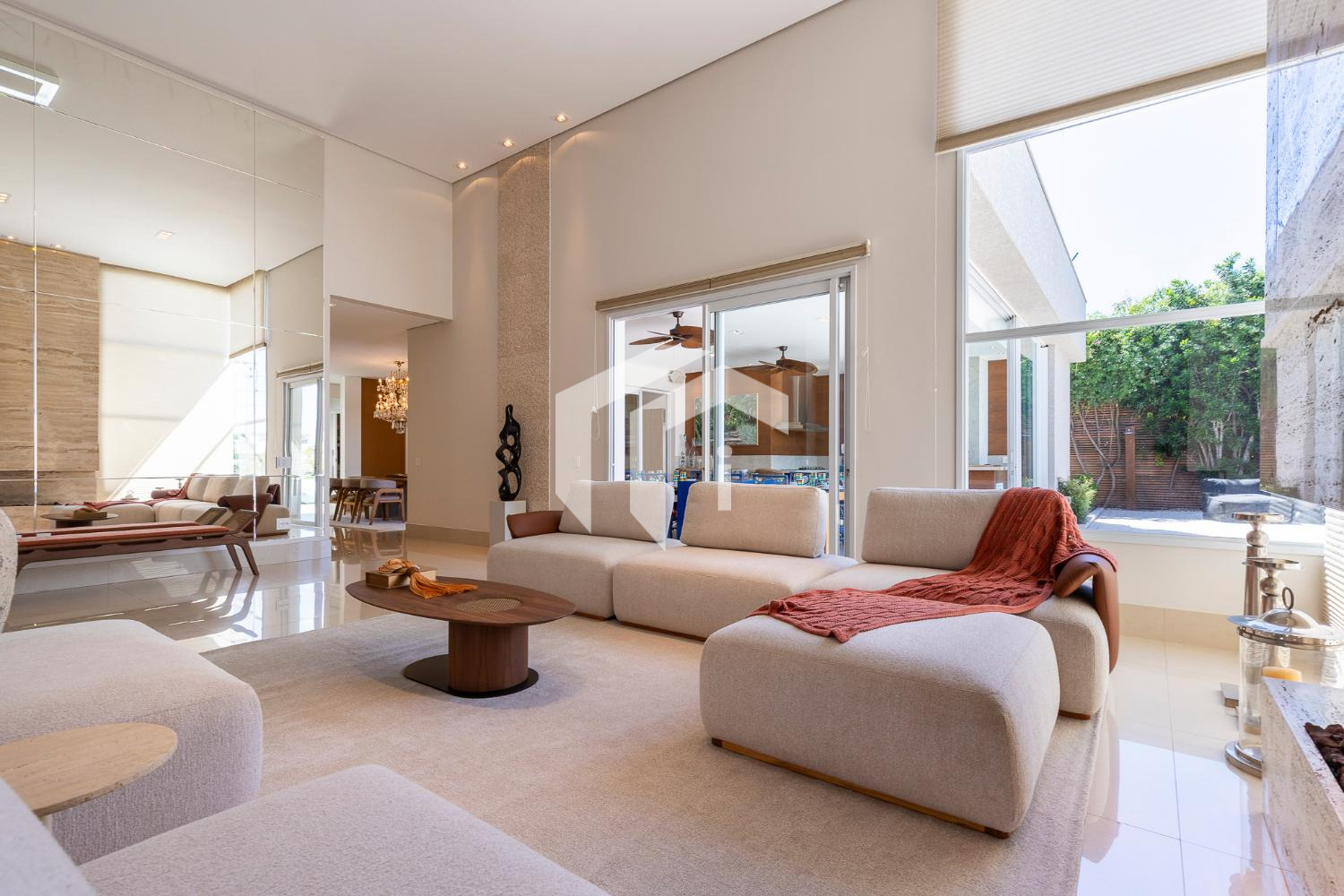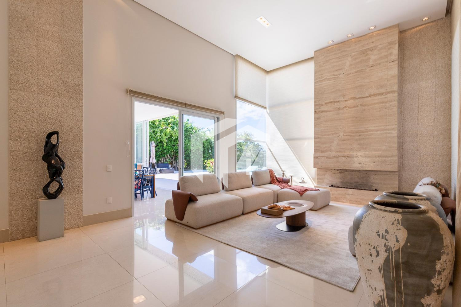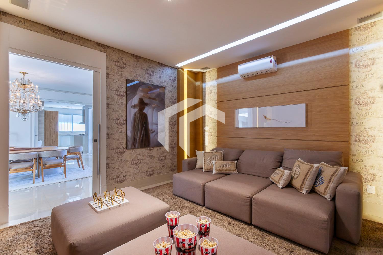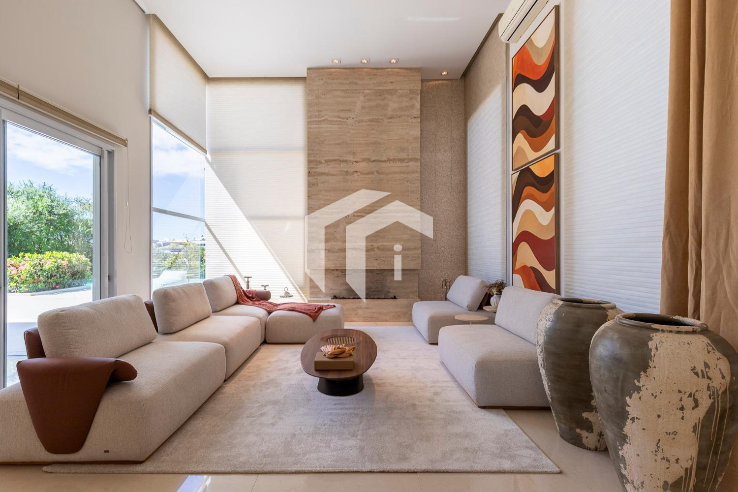 Living climatizado para 3 ambientes com pé direito duplo mais uma convidativa lareira, mais, home theater e home office, com o conforto do lavabo.