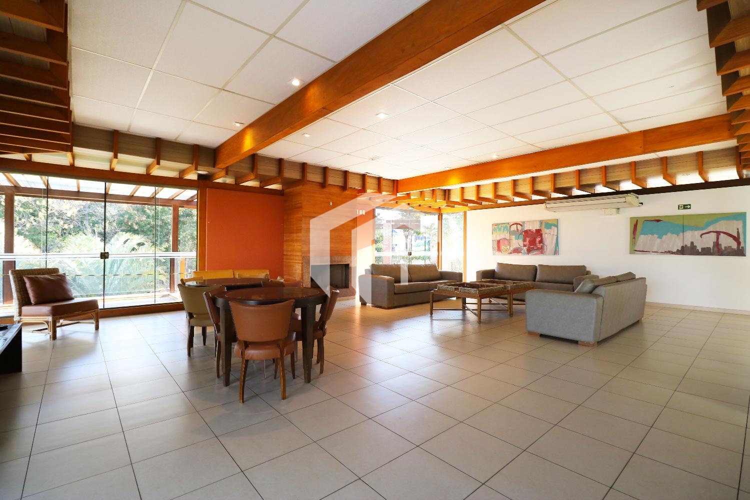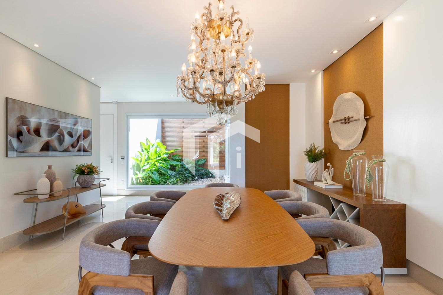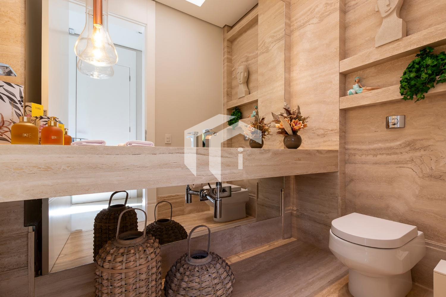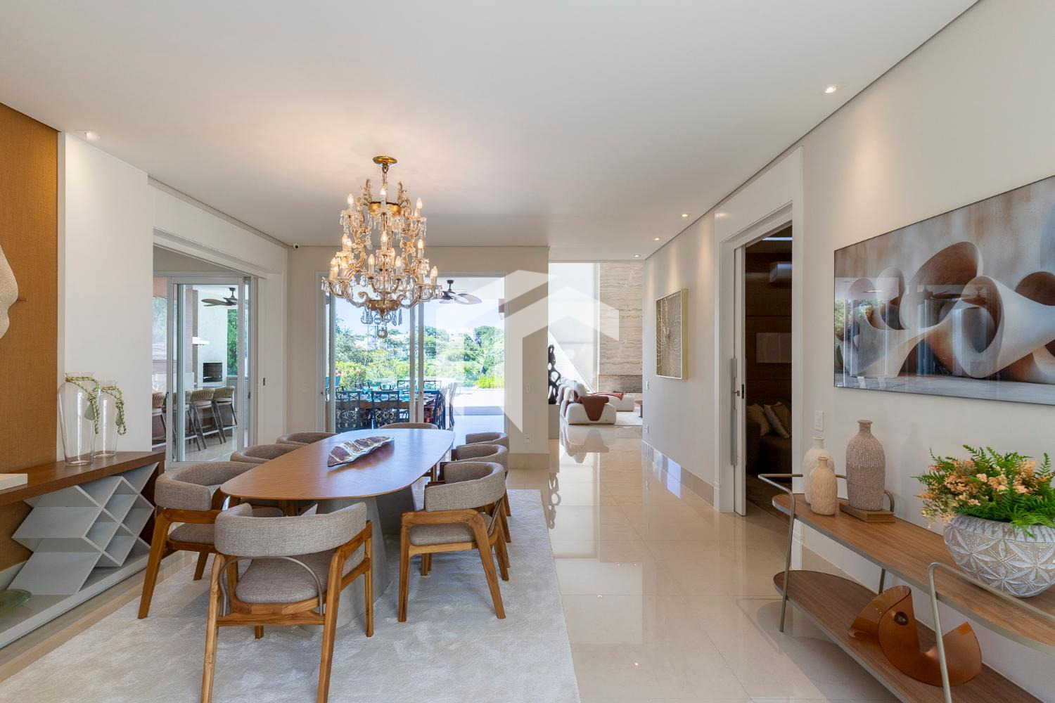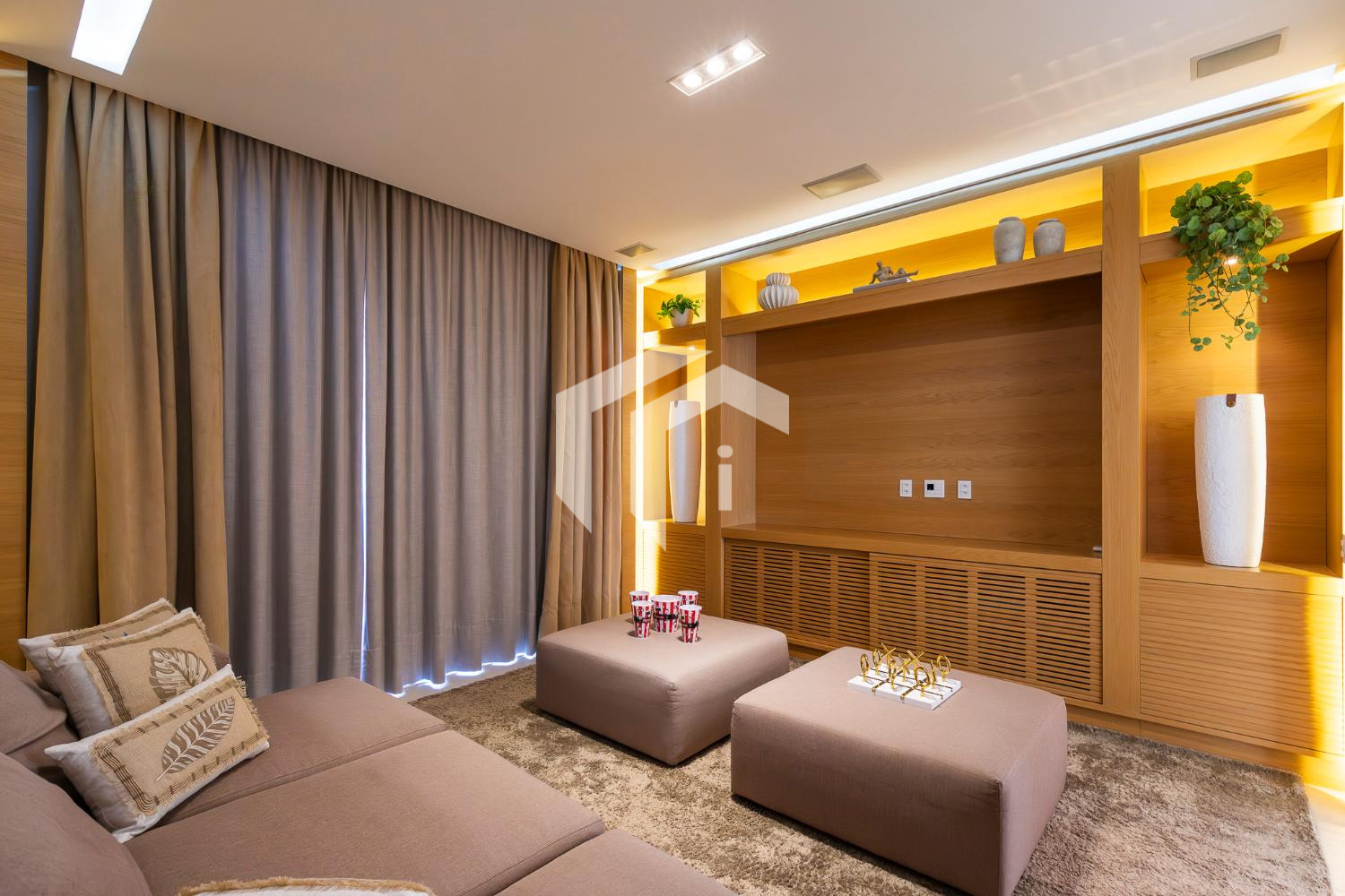 Living climatizado para 3 ambientes com pé direito duplo mais uma convidativa lareira, mais, home theater e home office, com o conforto do lavabo.