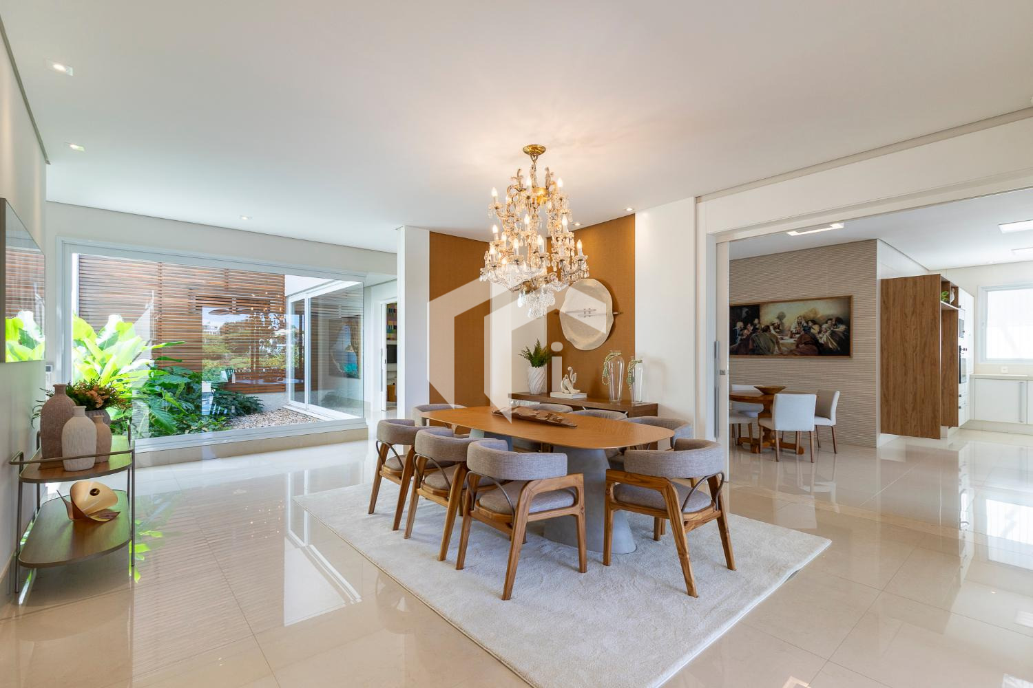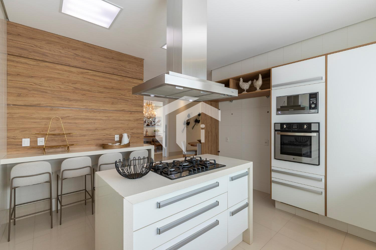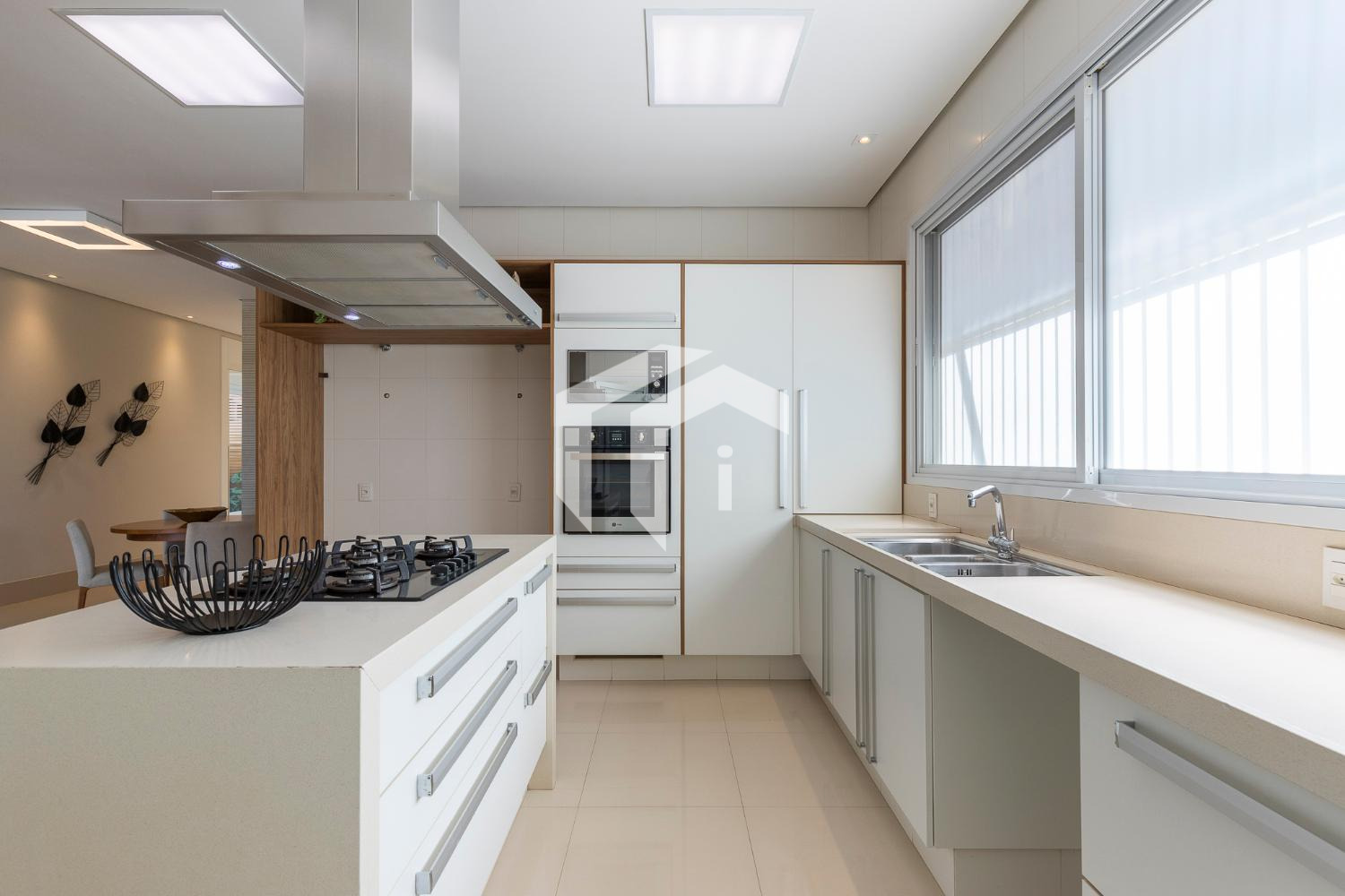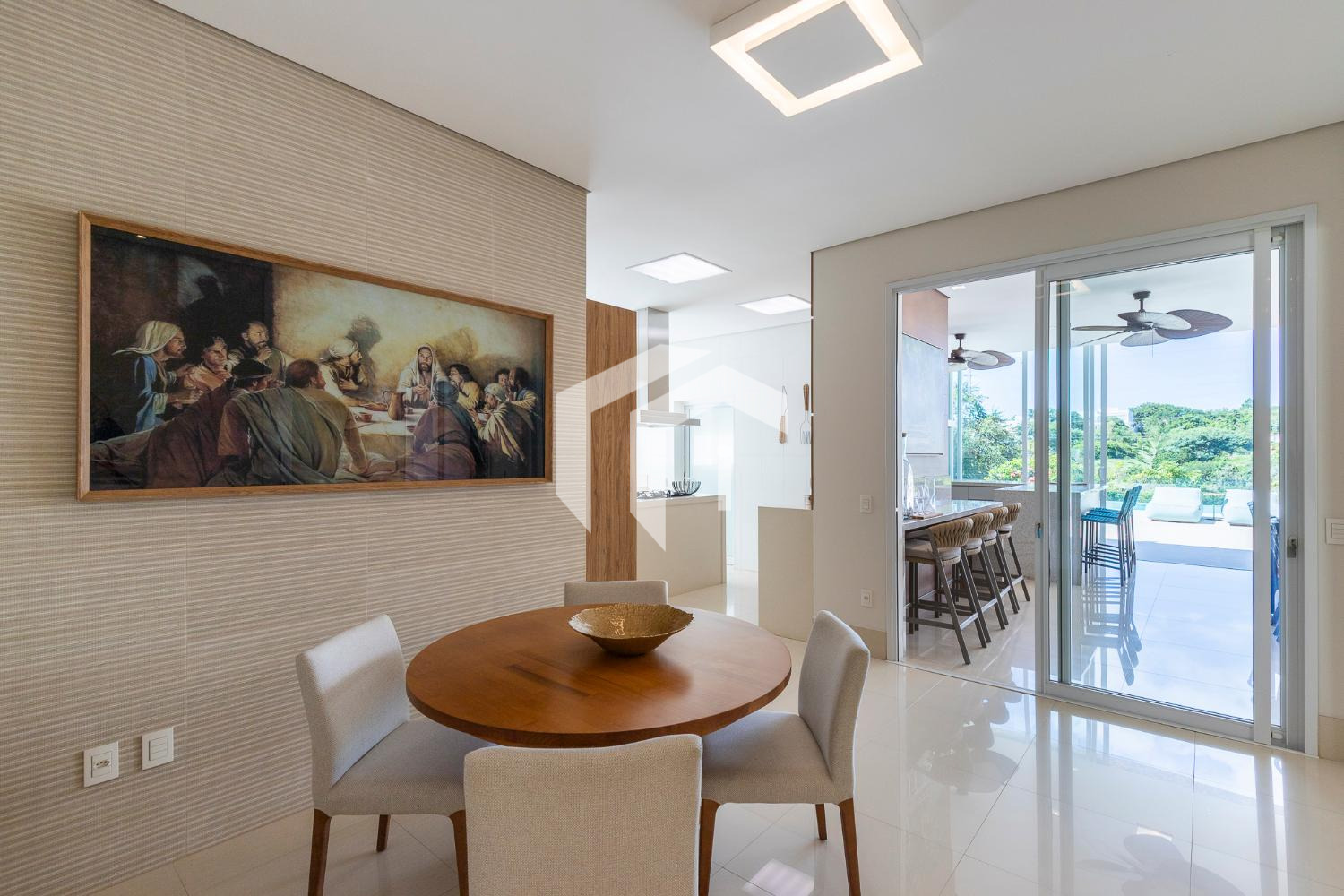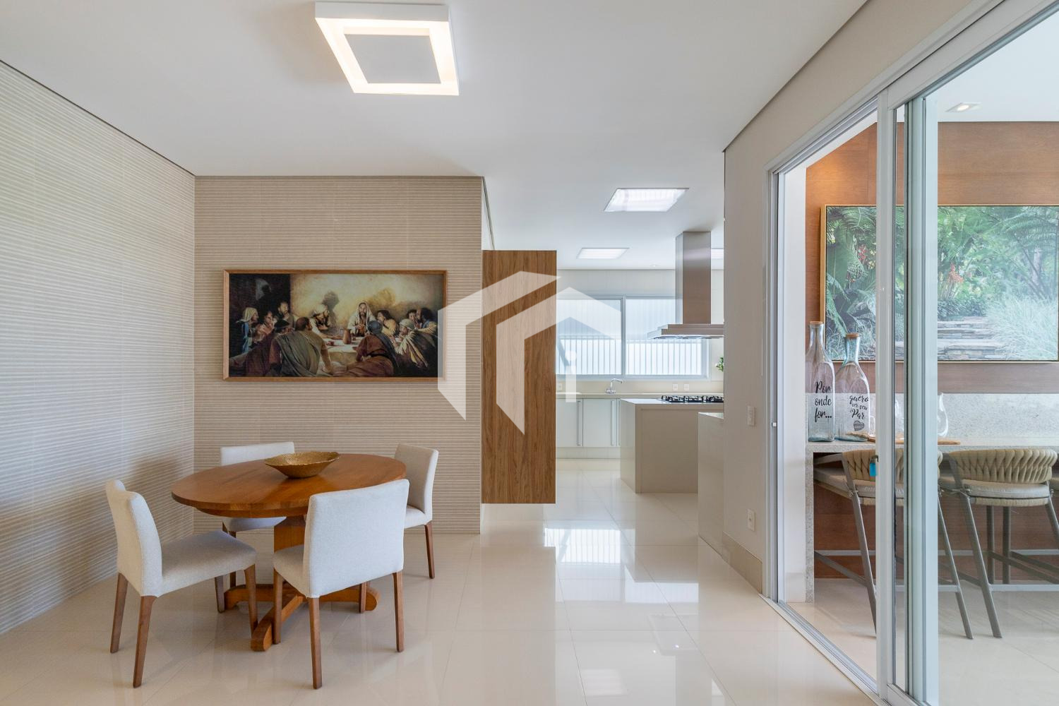 Sala de jantar bem posicionada e ao lado da área gourmet, abraçada por uma equipada cozinha planejada com copa e ampla despensa.