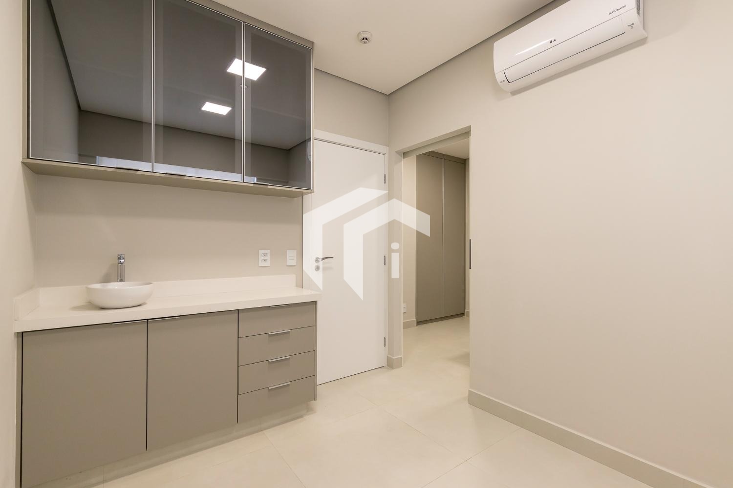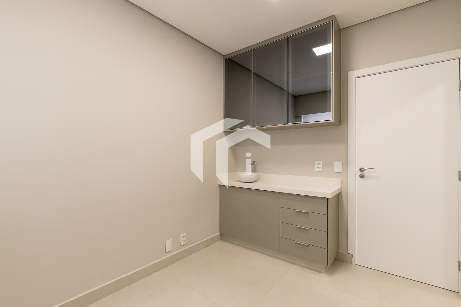 Toda acabada, já com piso, planejados, ar condidionado e iluminação, além de copa de apoio e 2 lavabos.