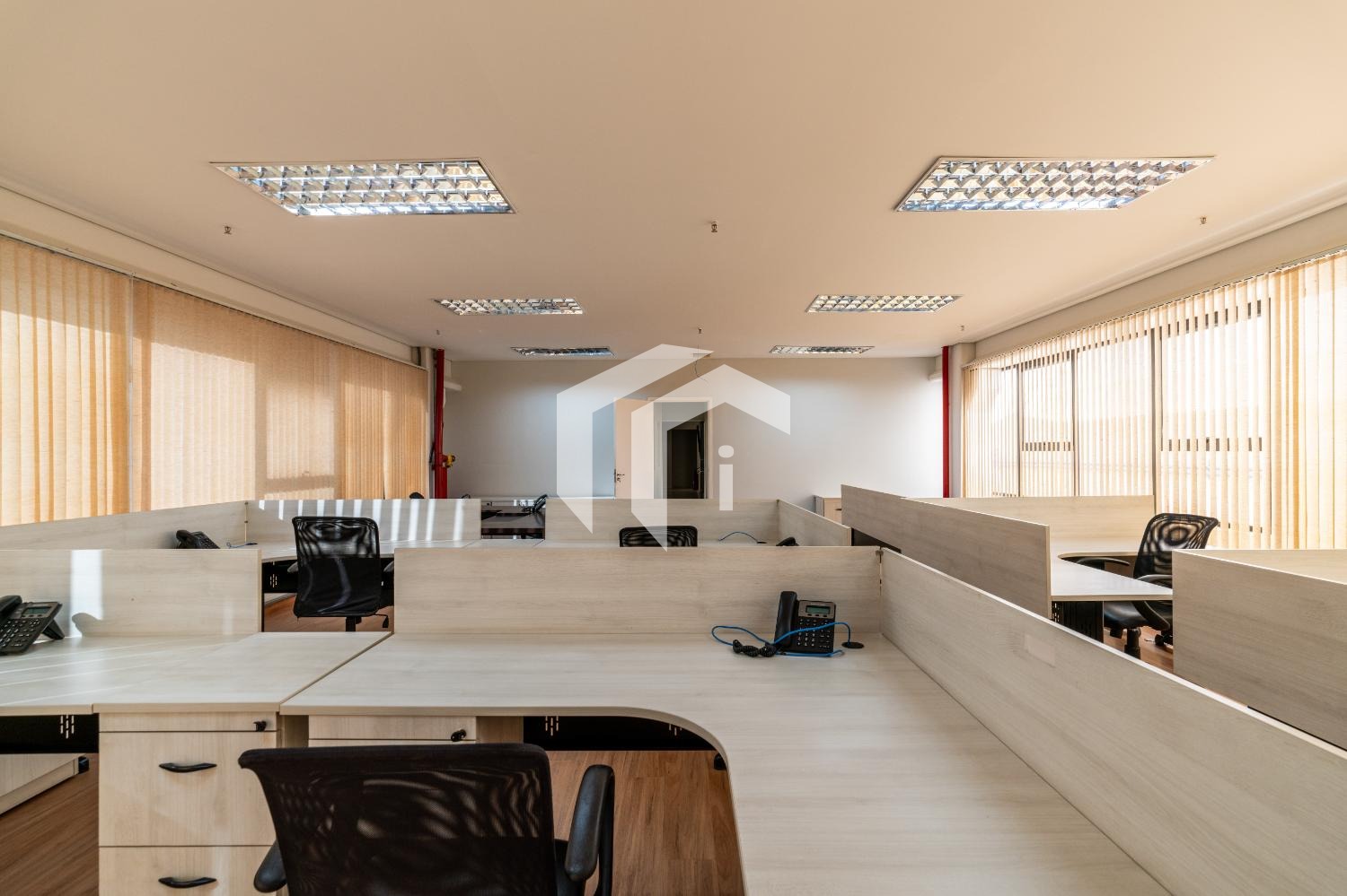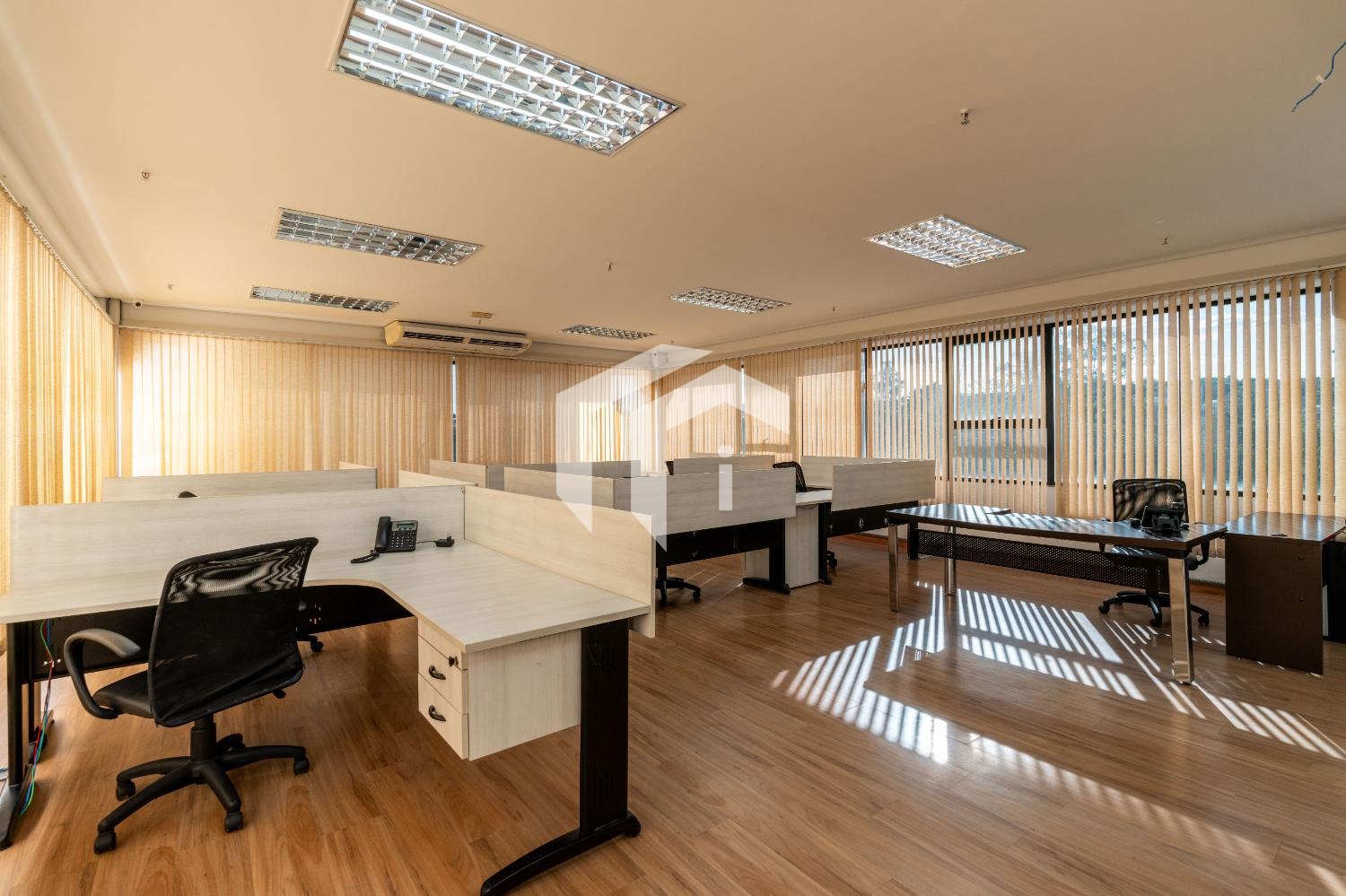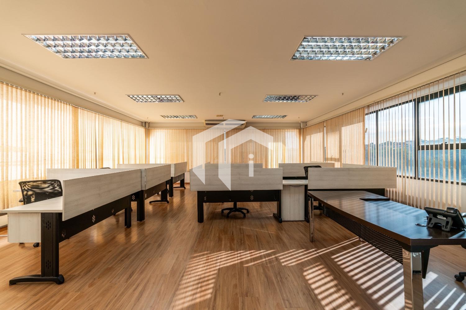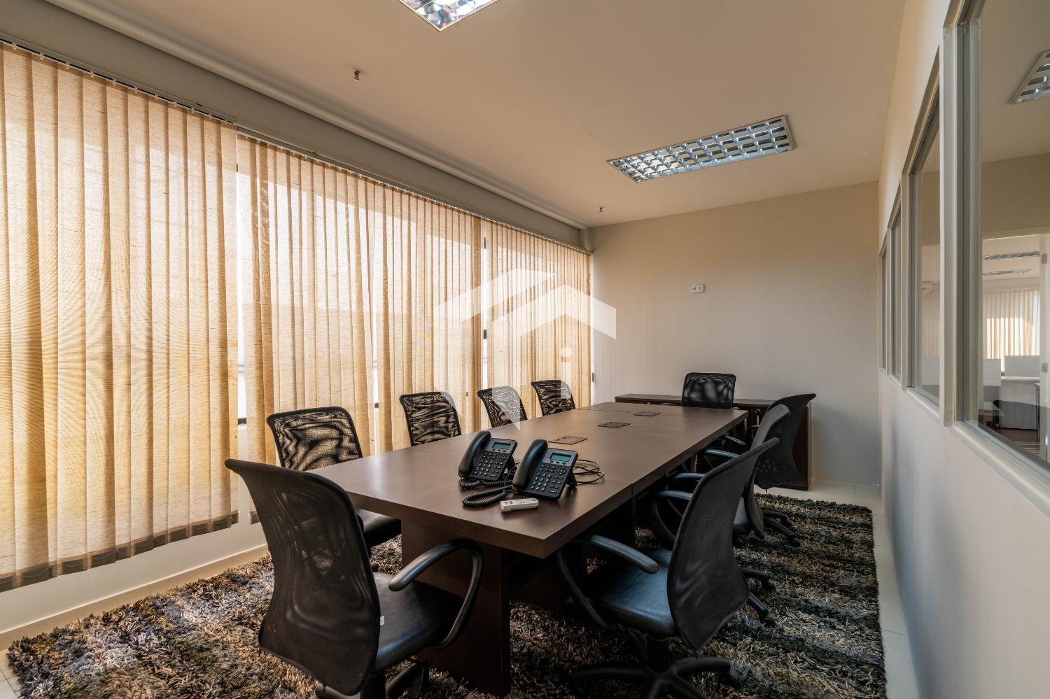 Sala comercial plenamente acabada com, piso elevado, rebaixo de teto com luminárias, ares condicionados e algumas mesas.