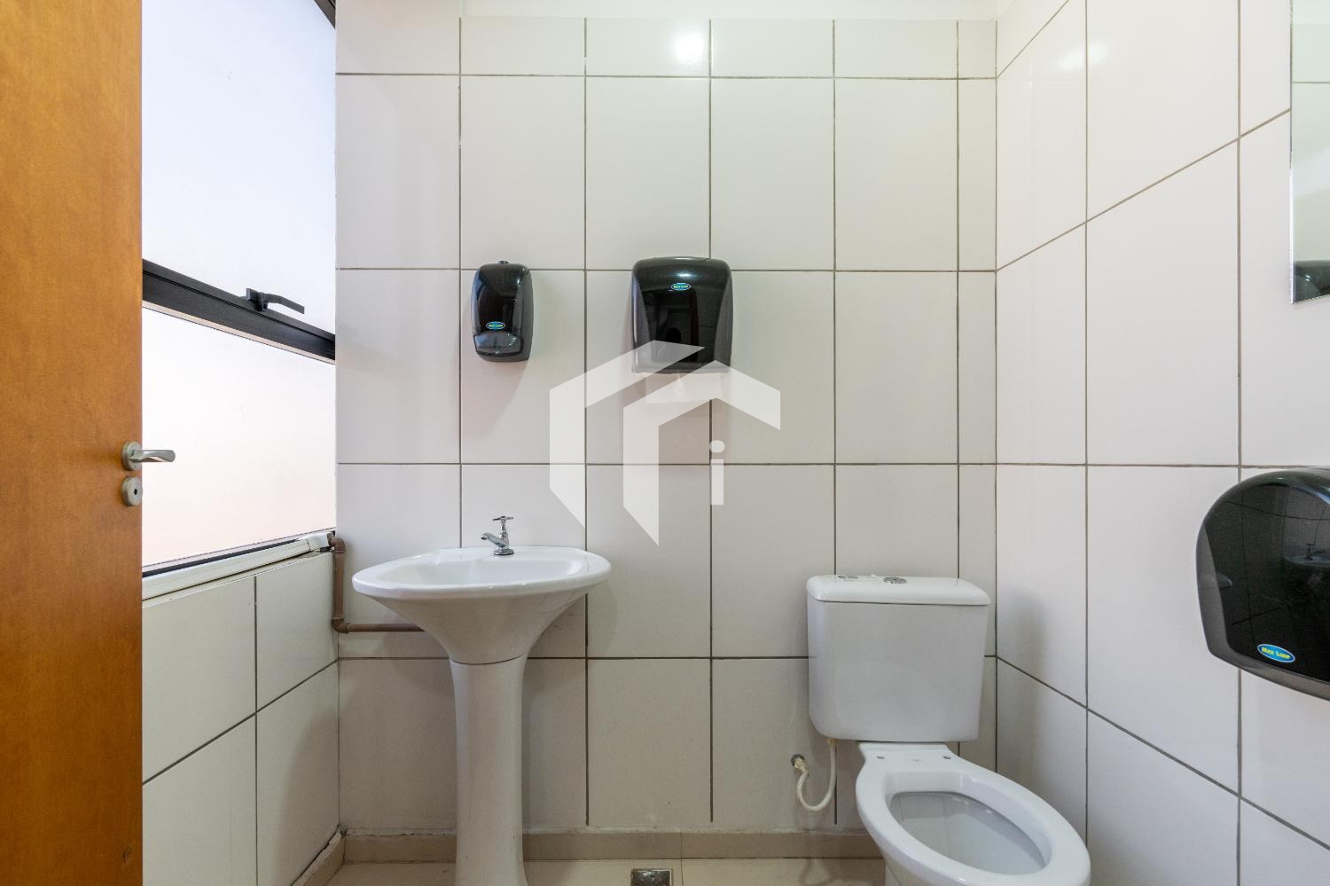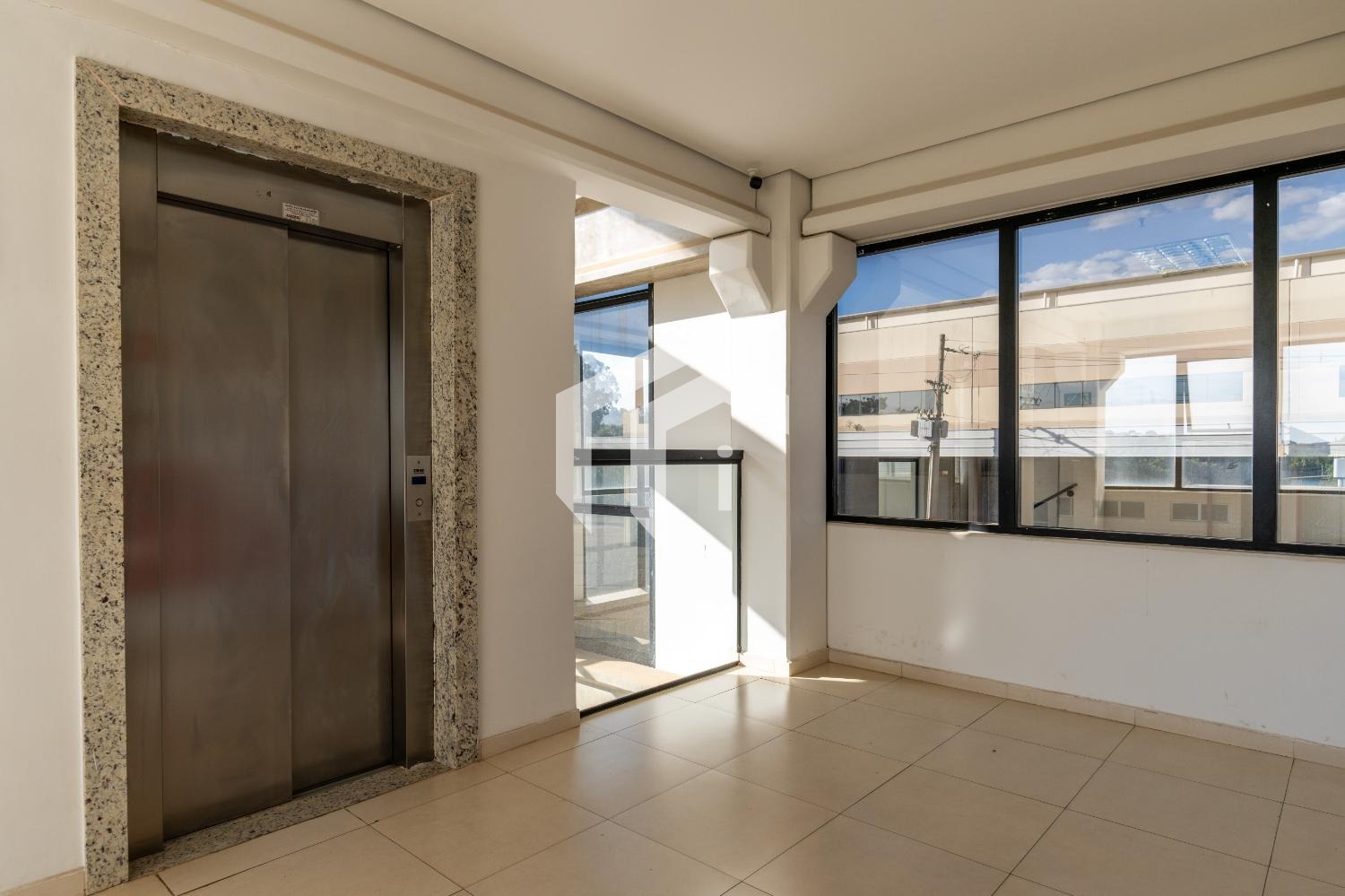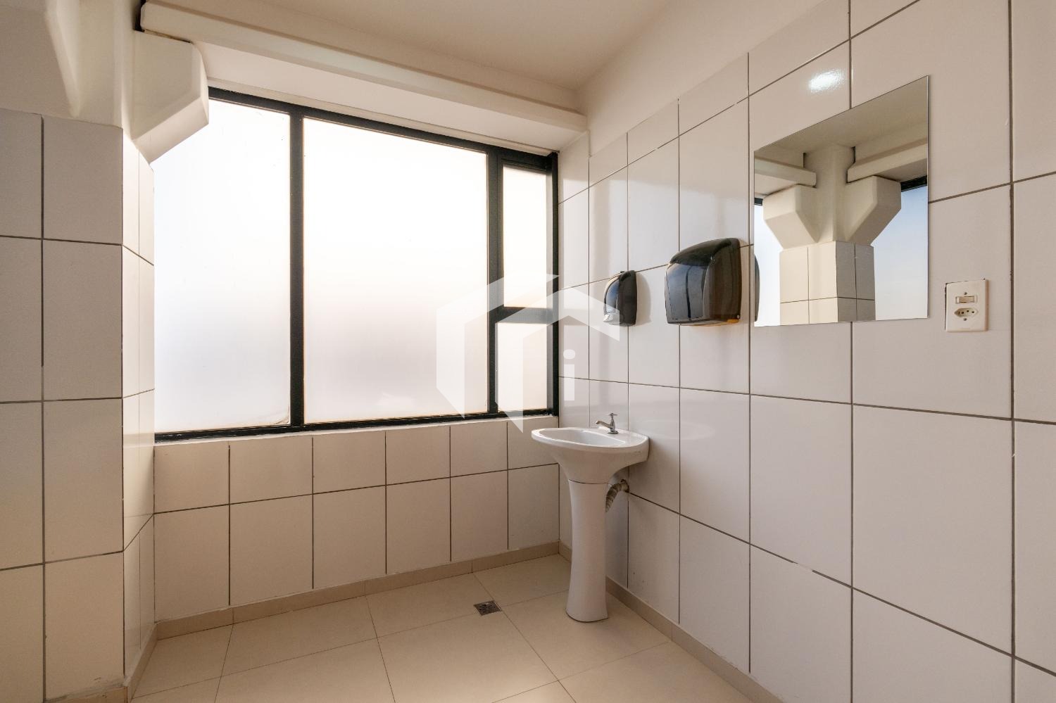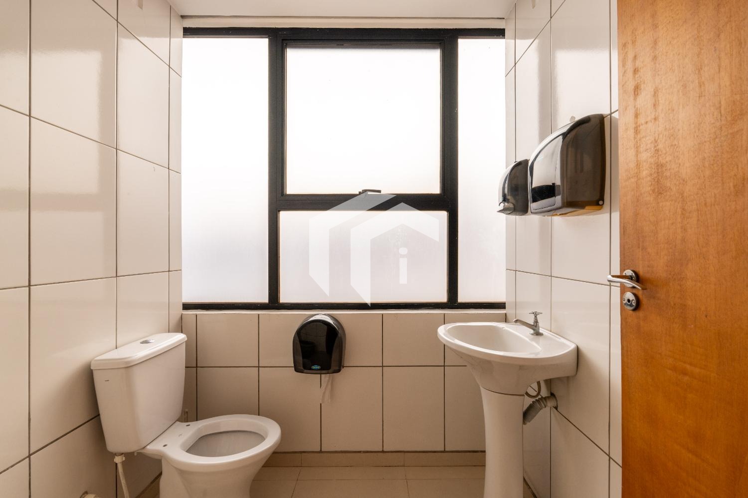 Sala comercial plenamente acabada com, piso elevado, rebaixo de teto com luminárias, ares condicionados e algumas mesas.