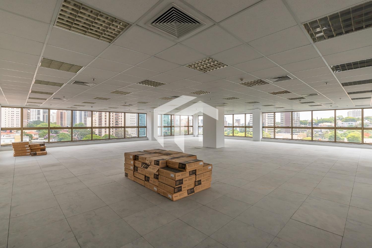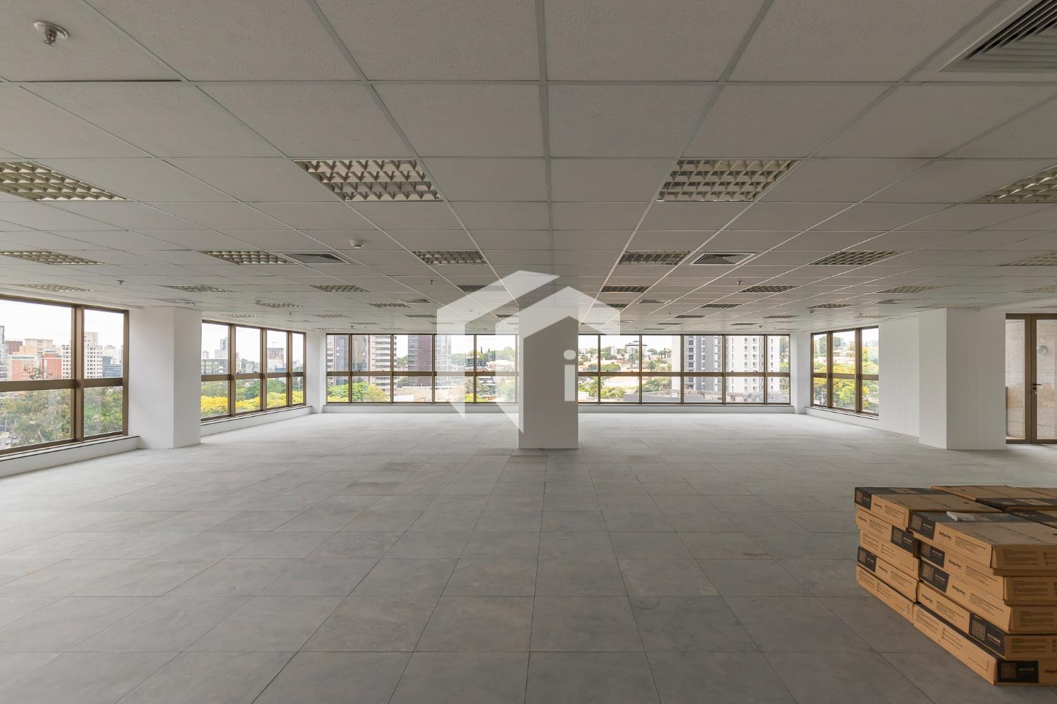 Piso elevado, carpete, rebaixo de teto, luminárias e ar condicionado.