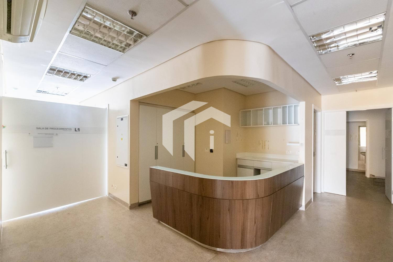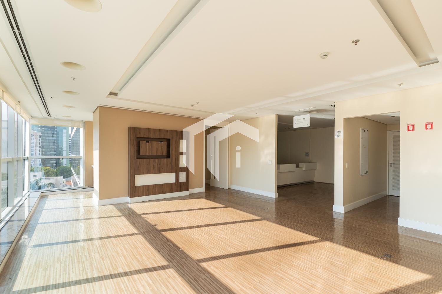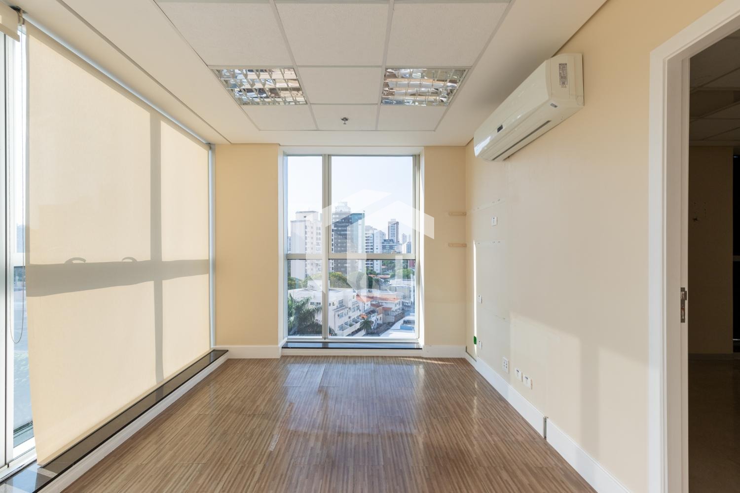 Sala acabada com piso elevado, rebaixo de teto, persianas, luminárias e ares condicionados, além, de diversas salas de drywall.