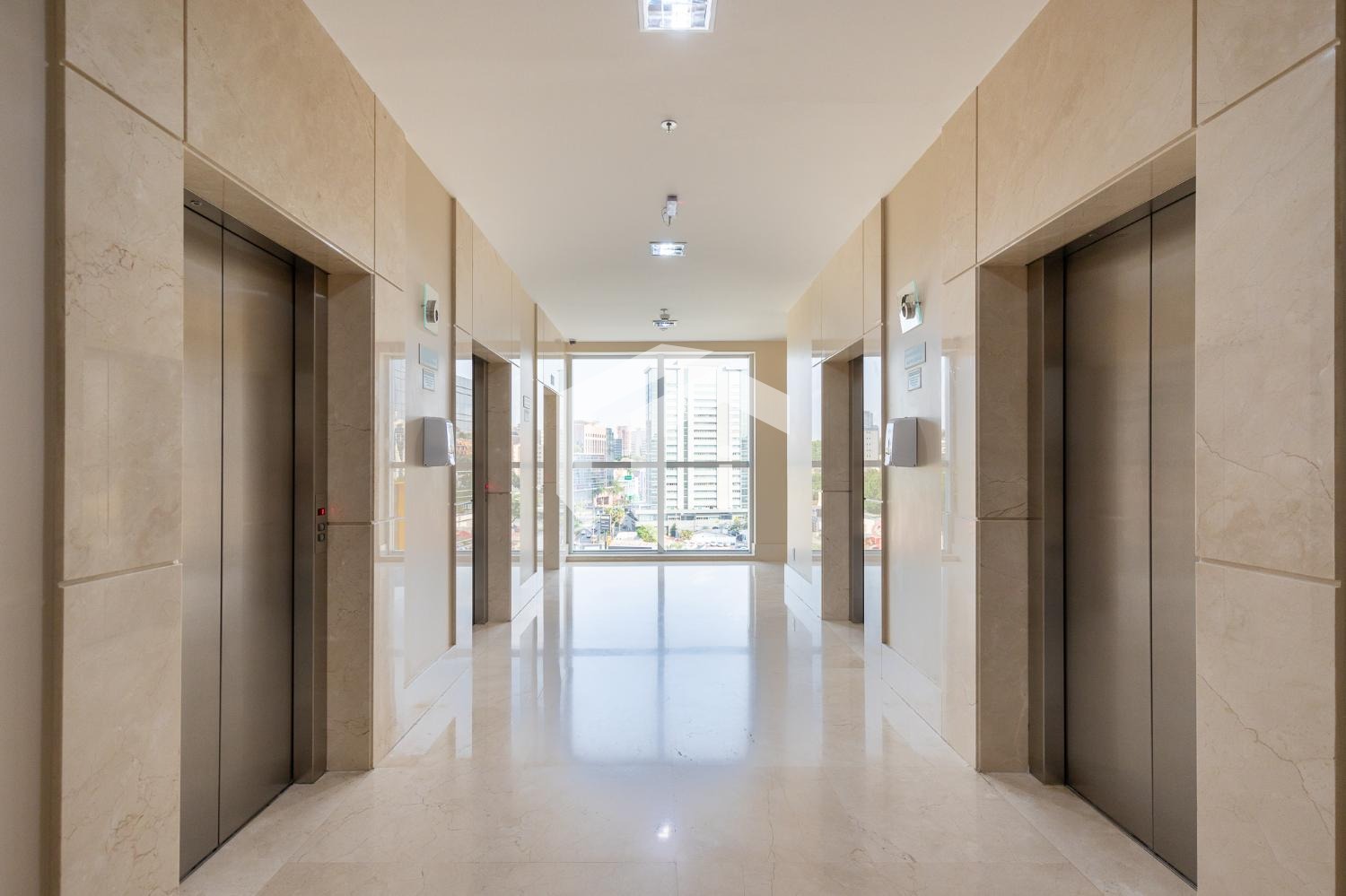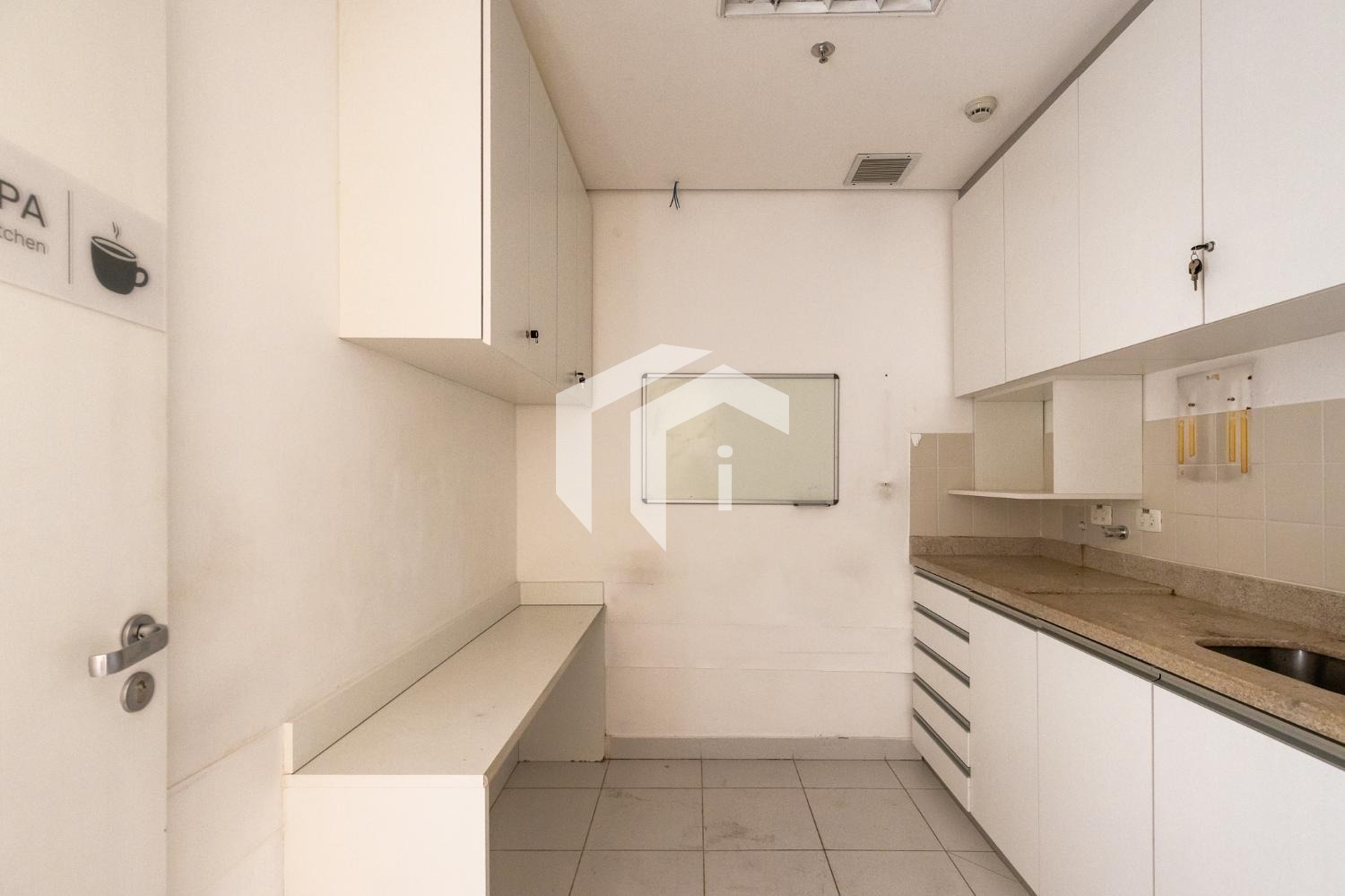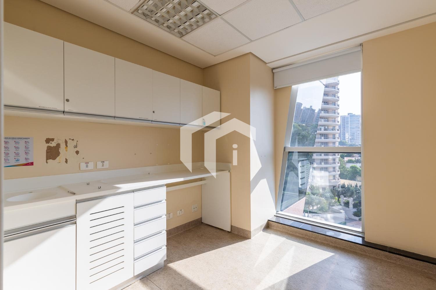 Sala acabada com piso elevado, rebaixo de teto, persianas, luminárias e ares condicionados, além, de diversas salas de drywall.