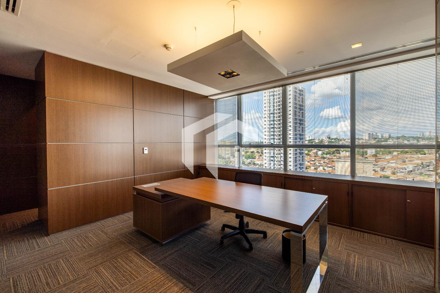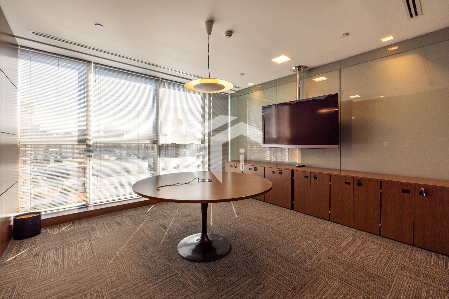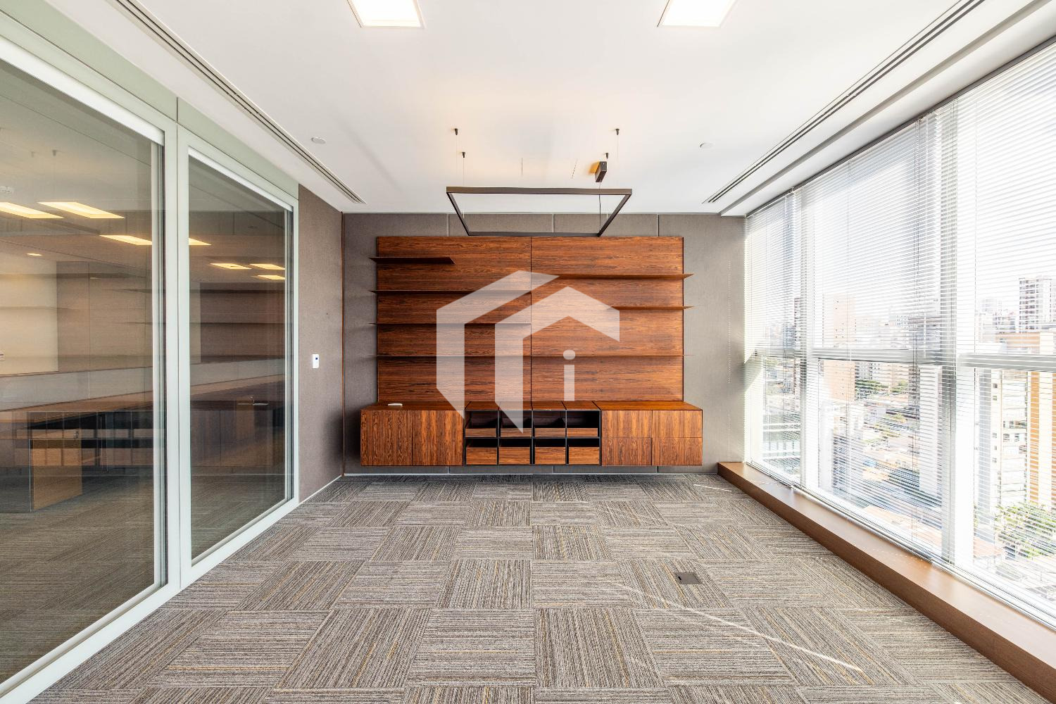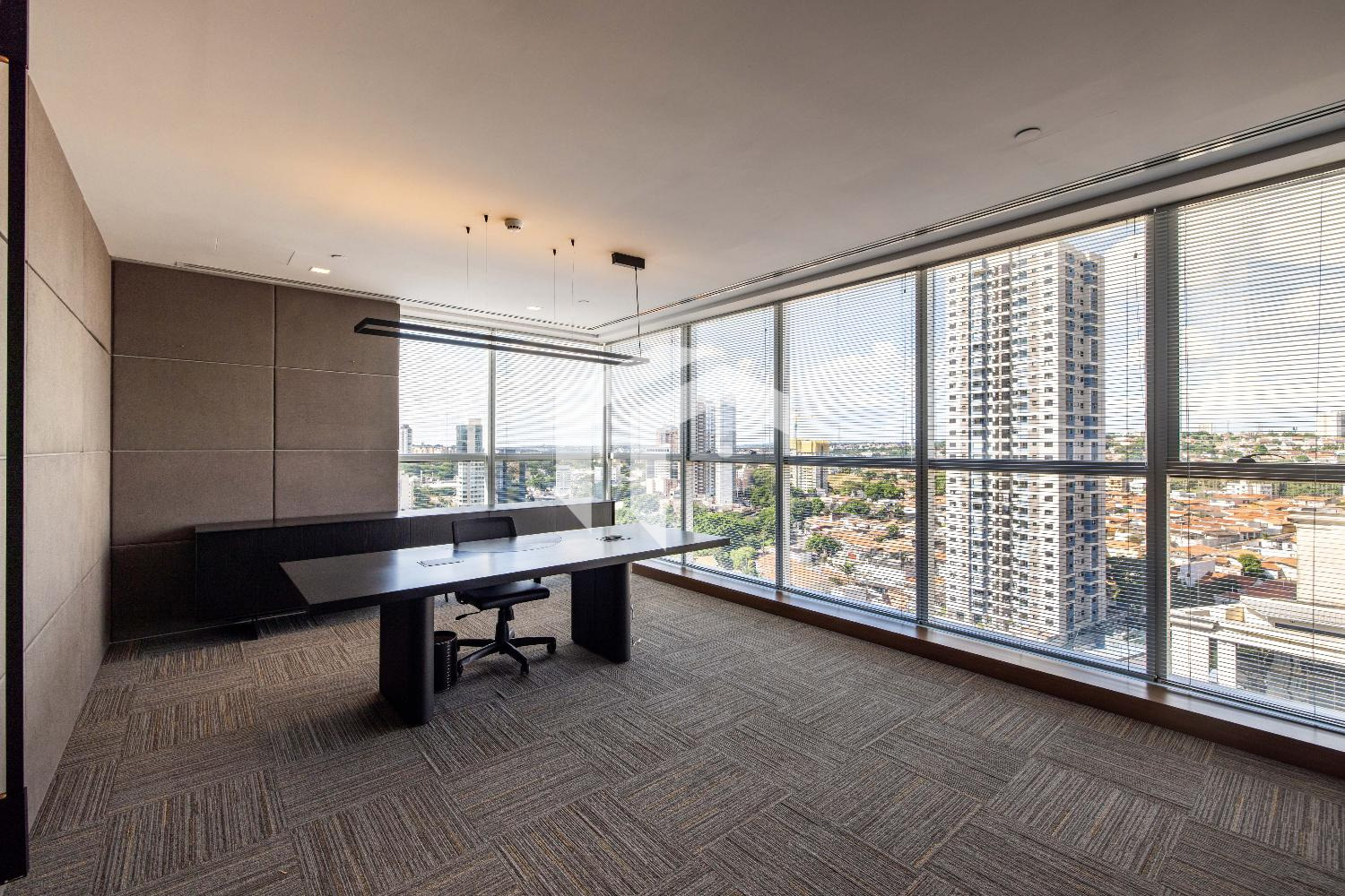 Acabada com forro de fibra mineral, piso elevado, carpete, rebaixo de teto, persianas, luminárias e ares condicionados.