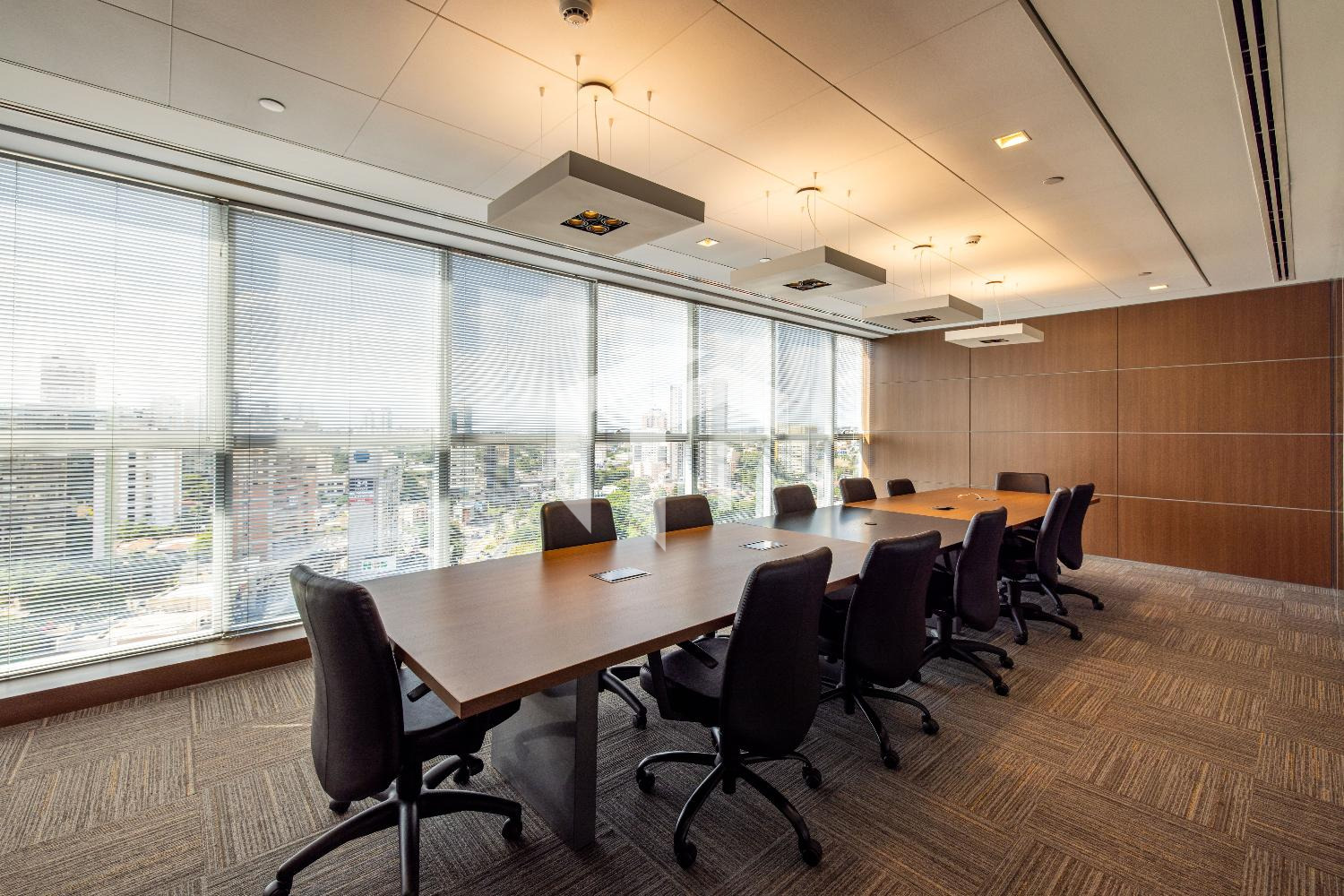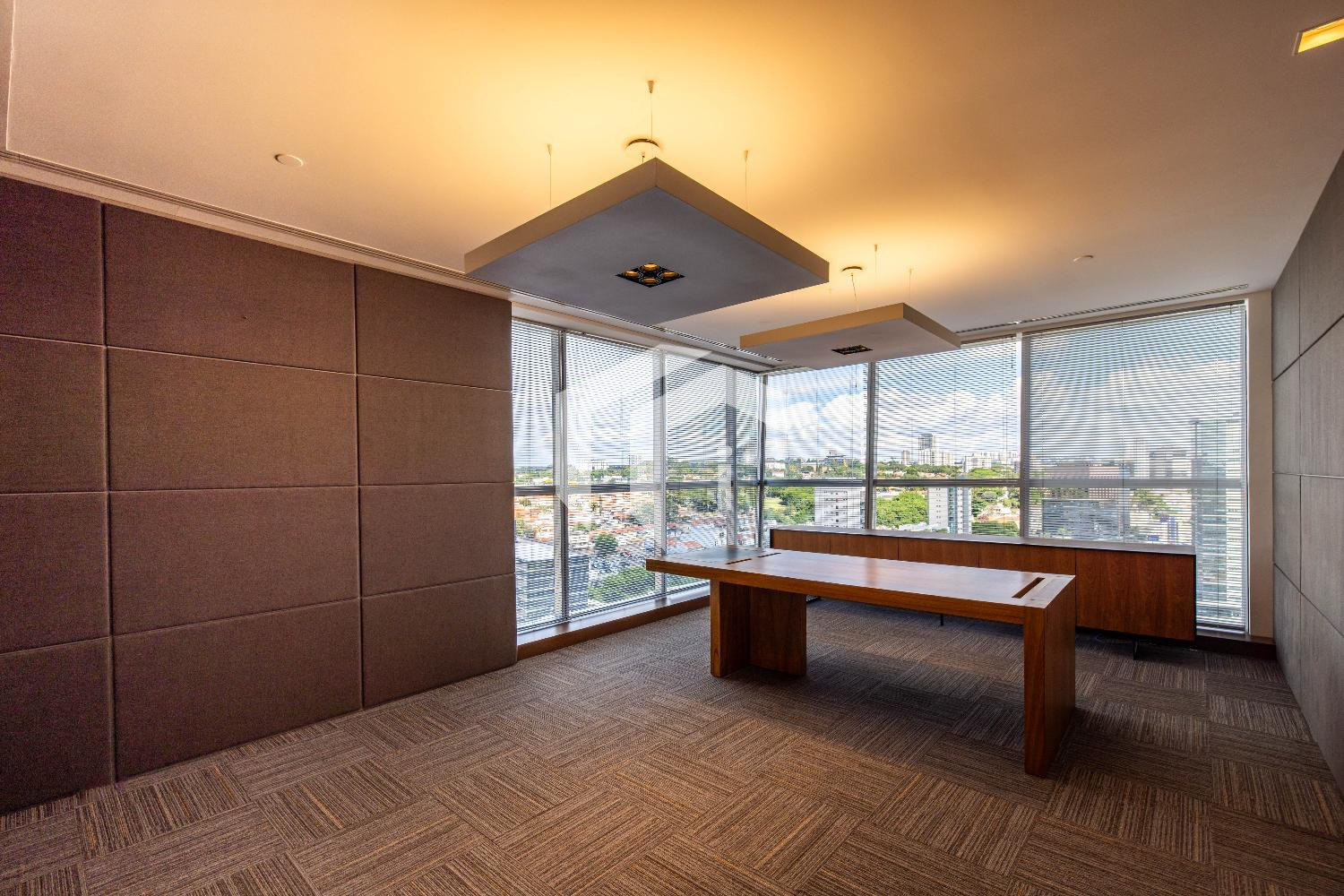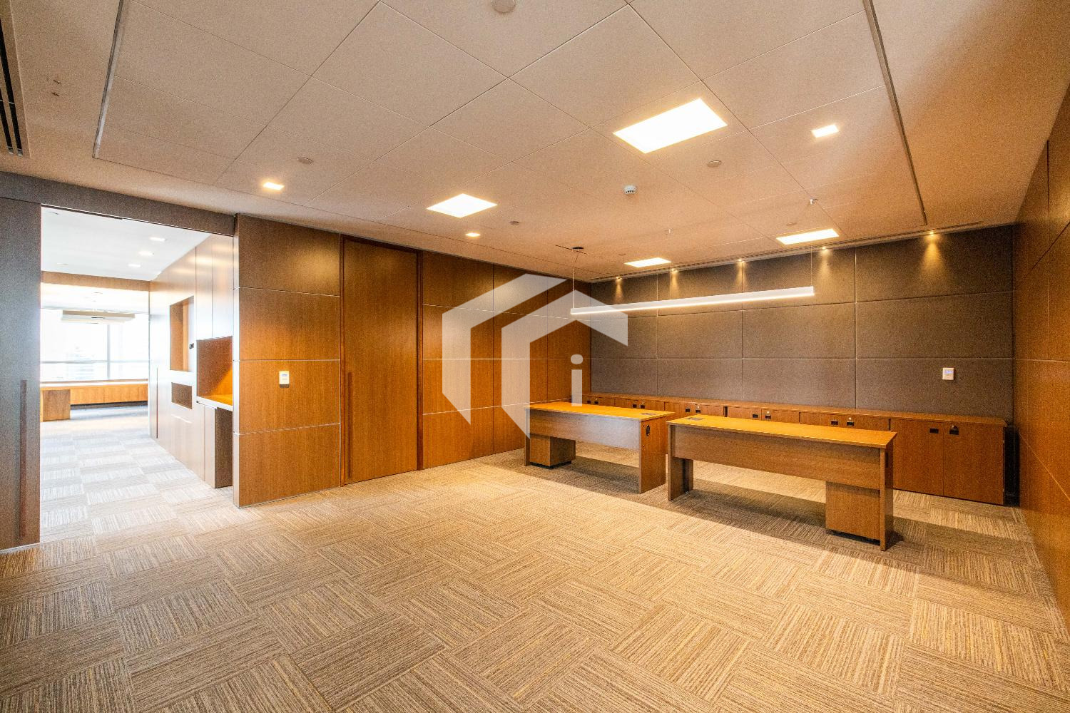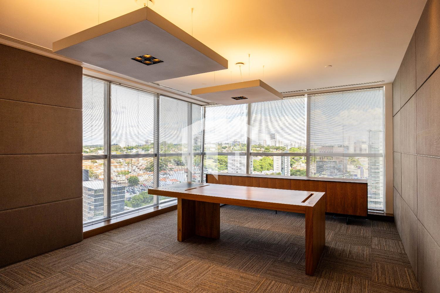Acabada com forro de fibra mineral, piso elevado, carpete, rebaixo de teto, persianas, luminárias e ares condicionados.