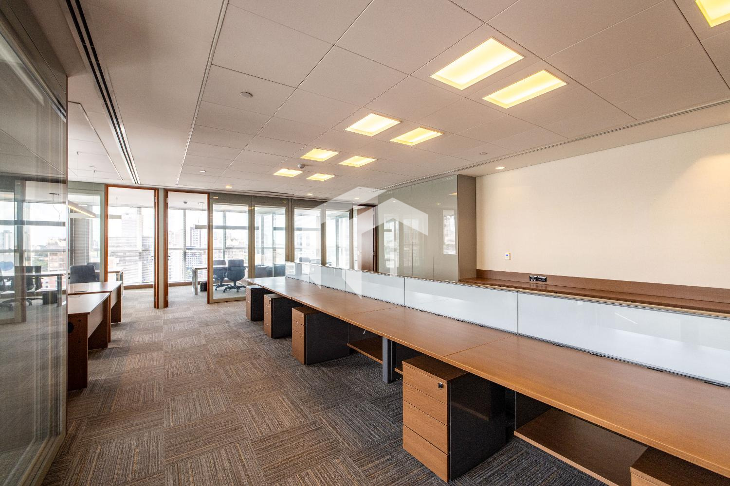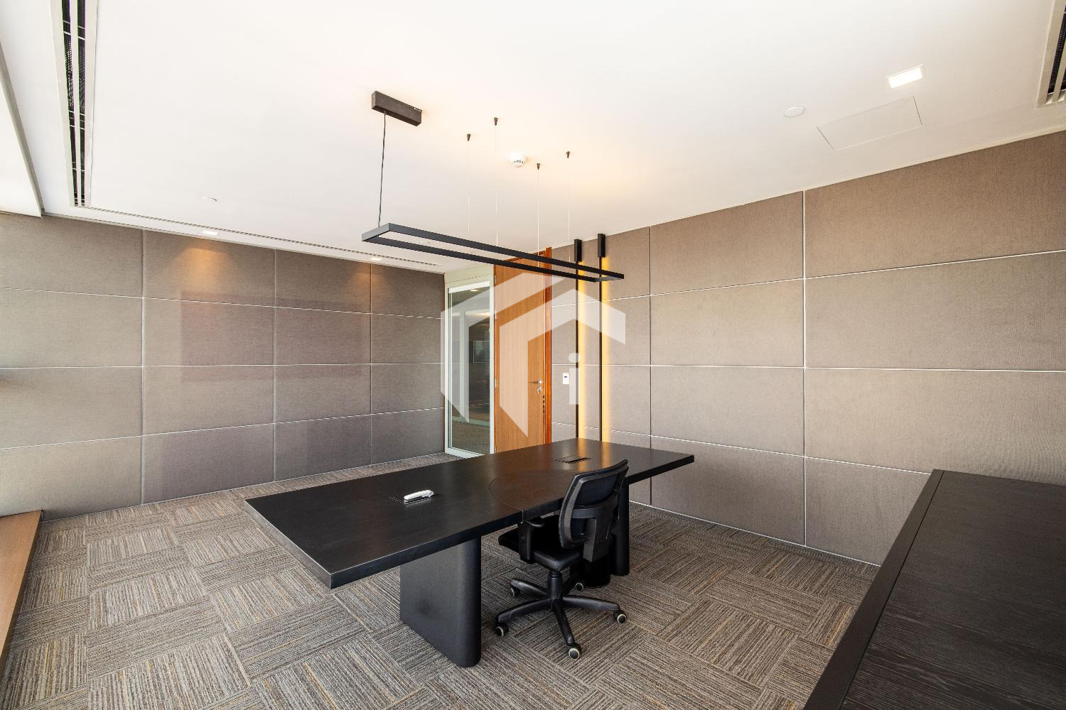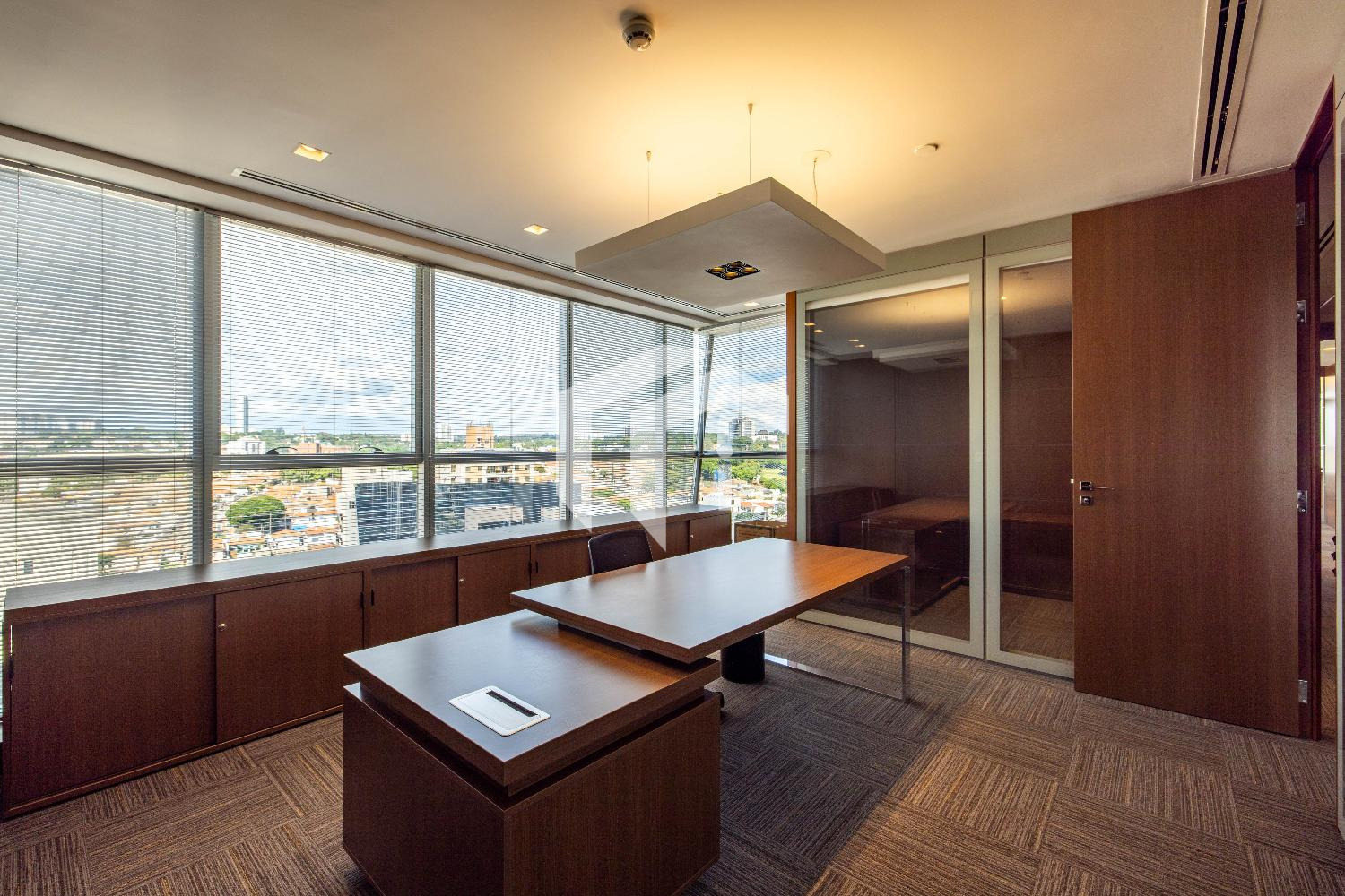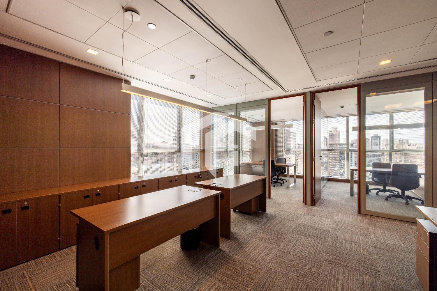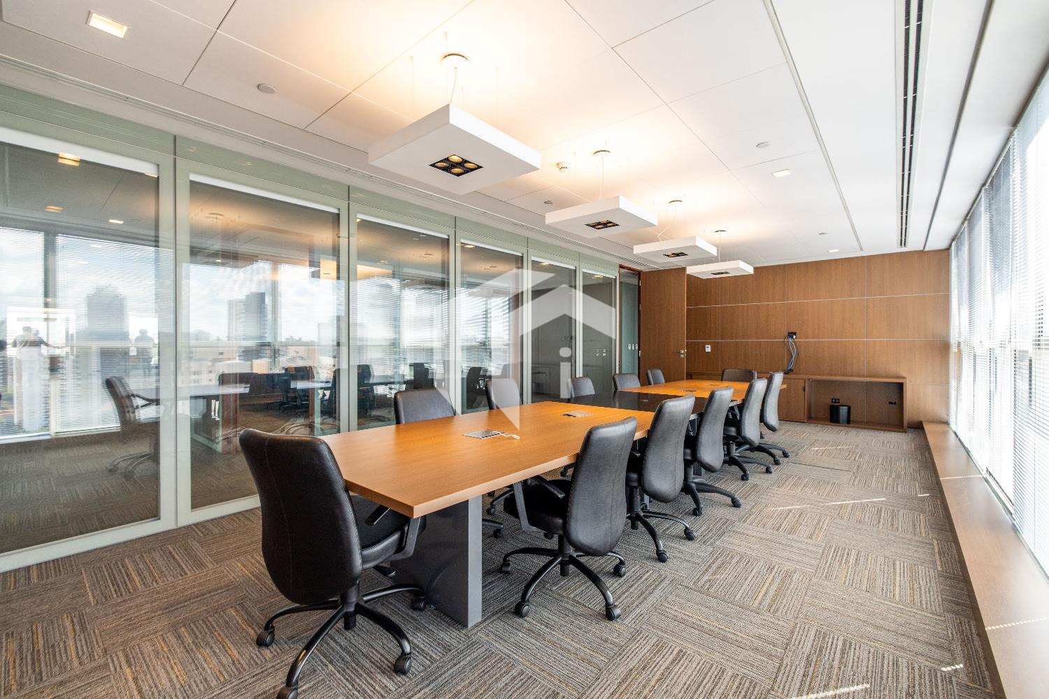 Acabada com forro de fibra mineral, piso elevado, carpete, rebaixo de teto, persianas, luminárias e ares condicionados.