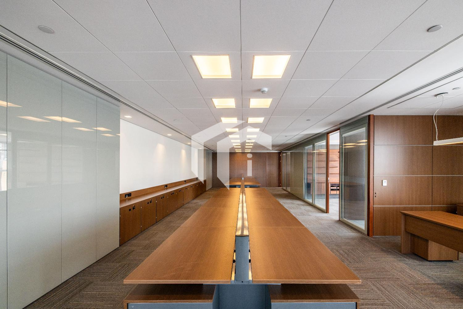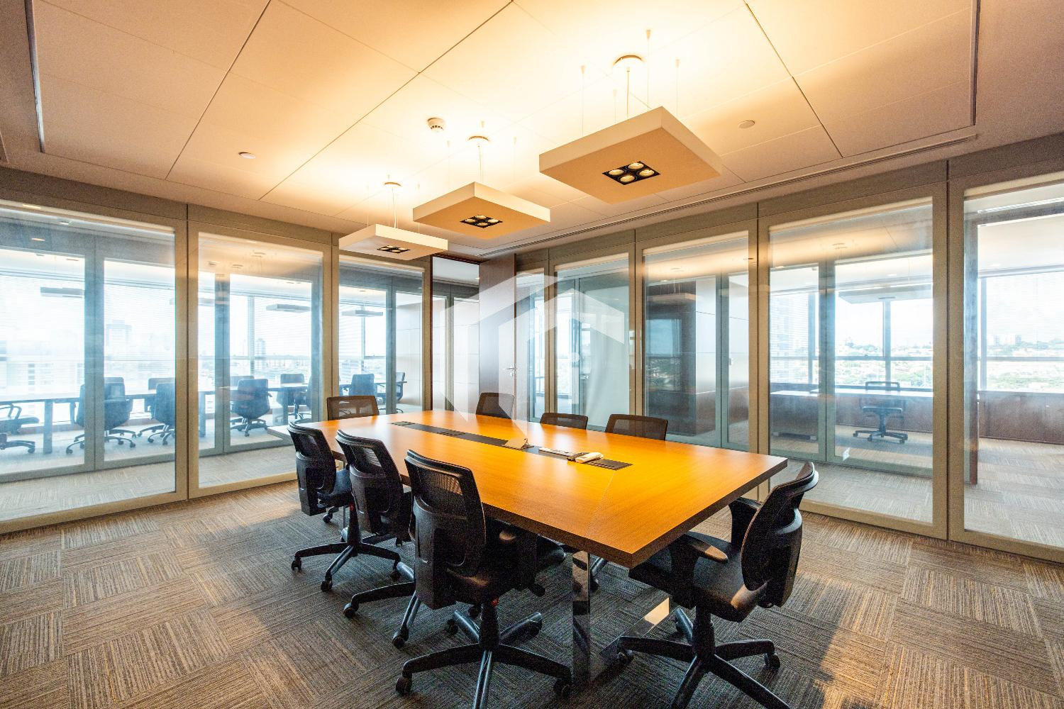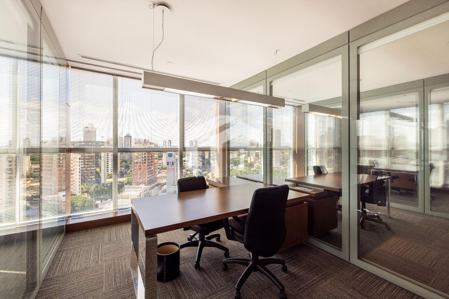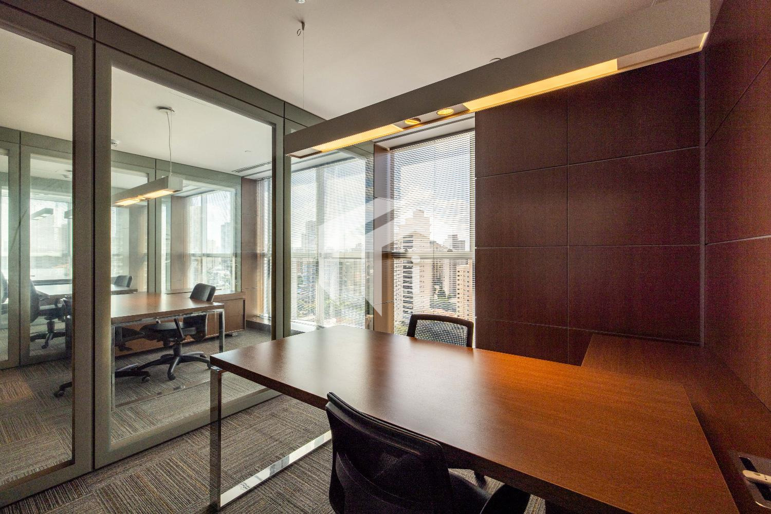 Acabada com forro de fibra mineral, piso elevado, carpete, rebaixo de teto, persianas, luminárias e ares condicionados.