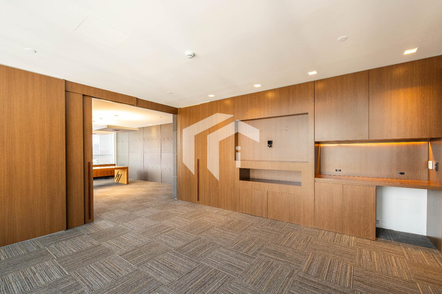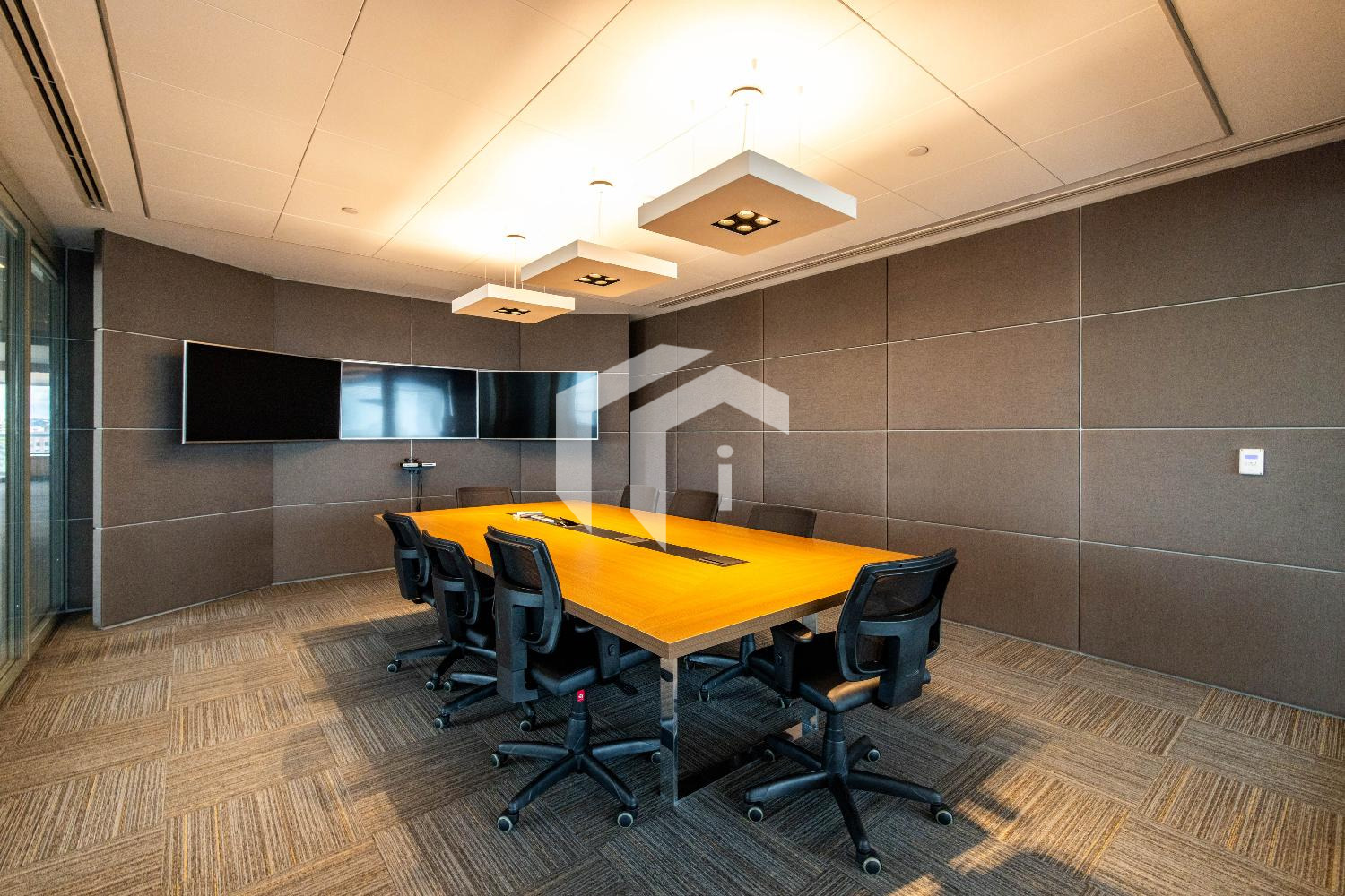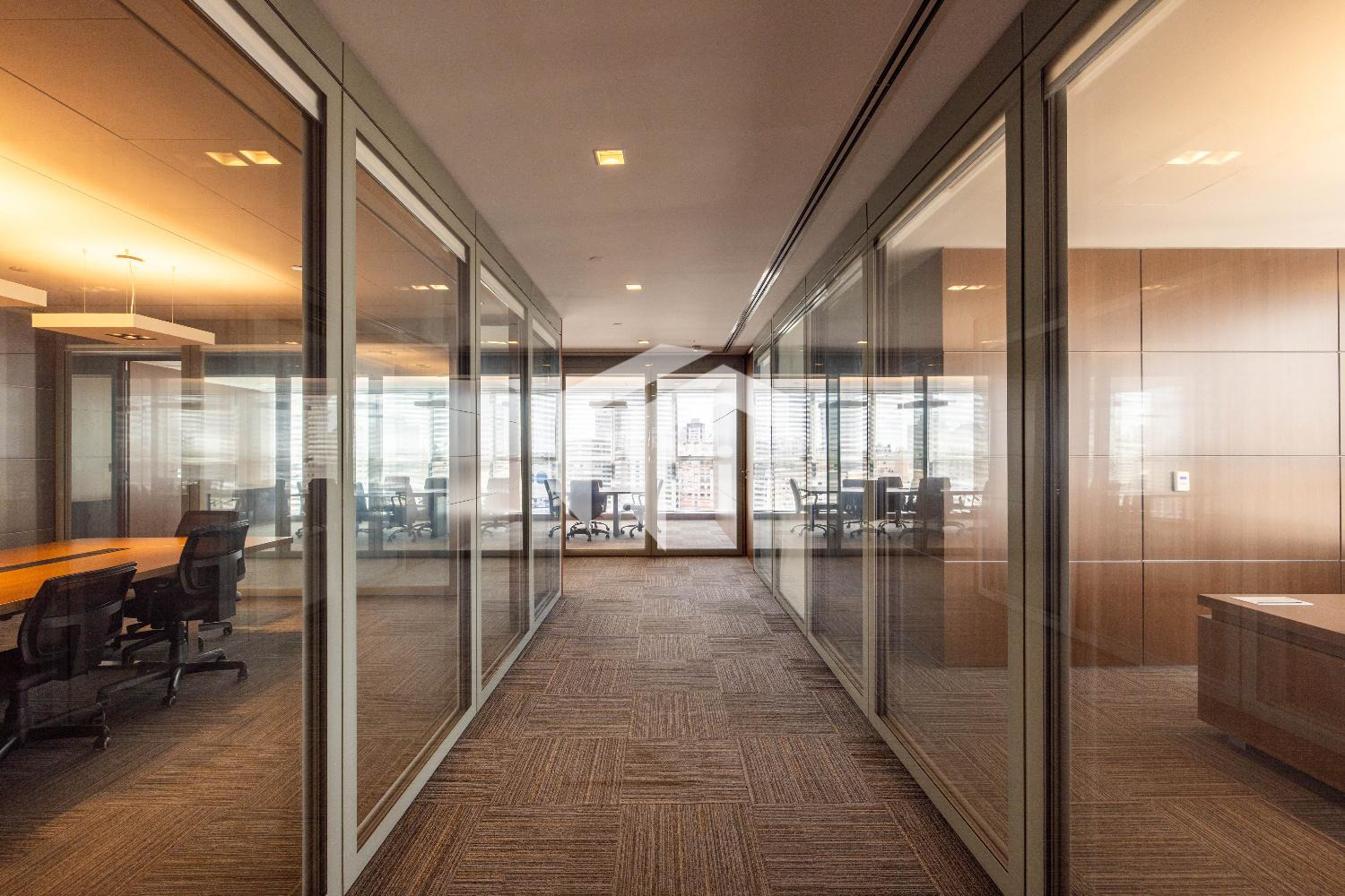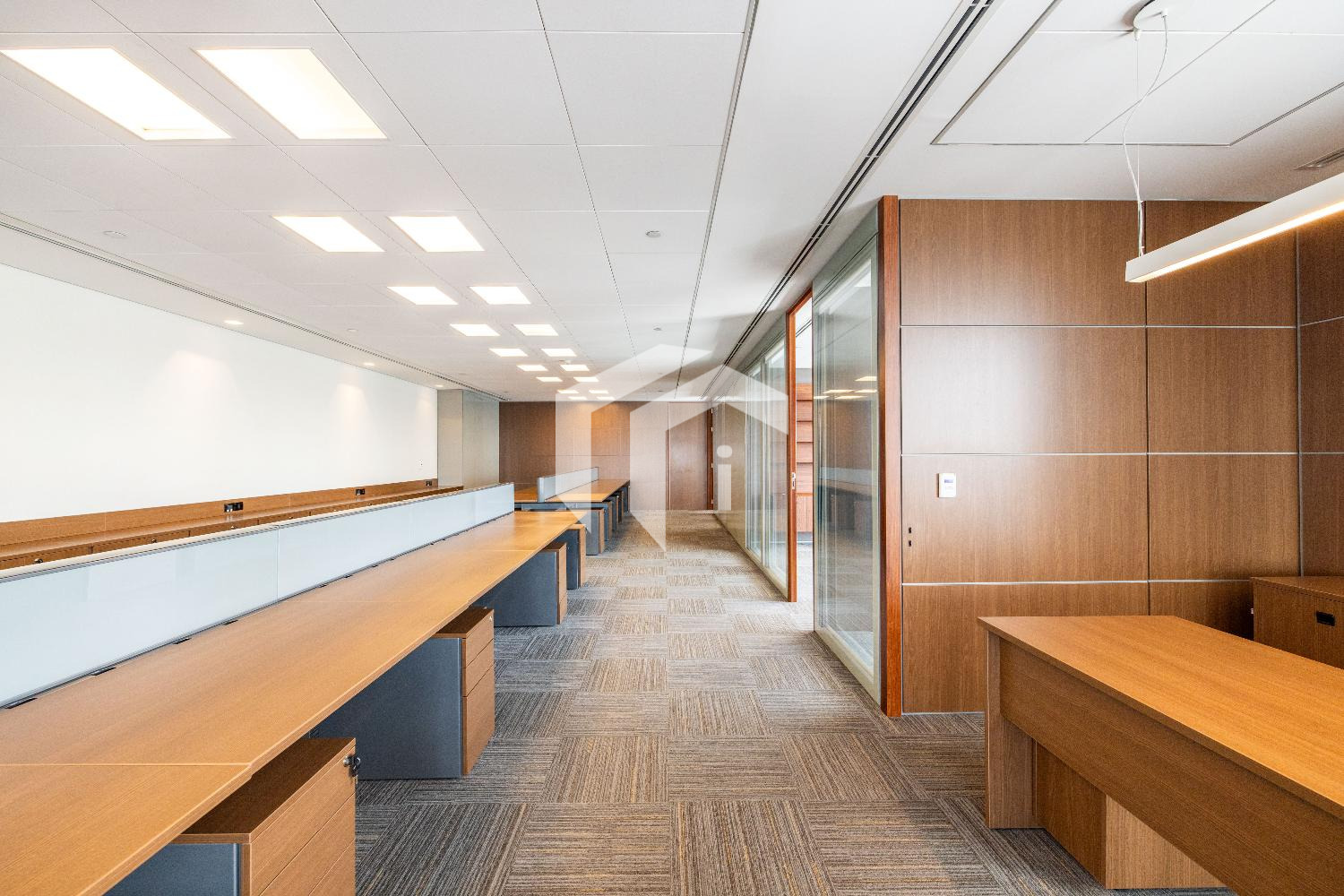 Acabada com forro de fibra mineral, piso elevado, carpete, rebaixo de teto, persianas, luminárias e ares condicionados.